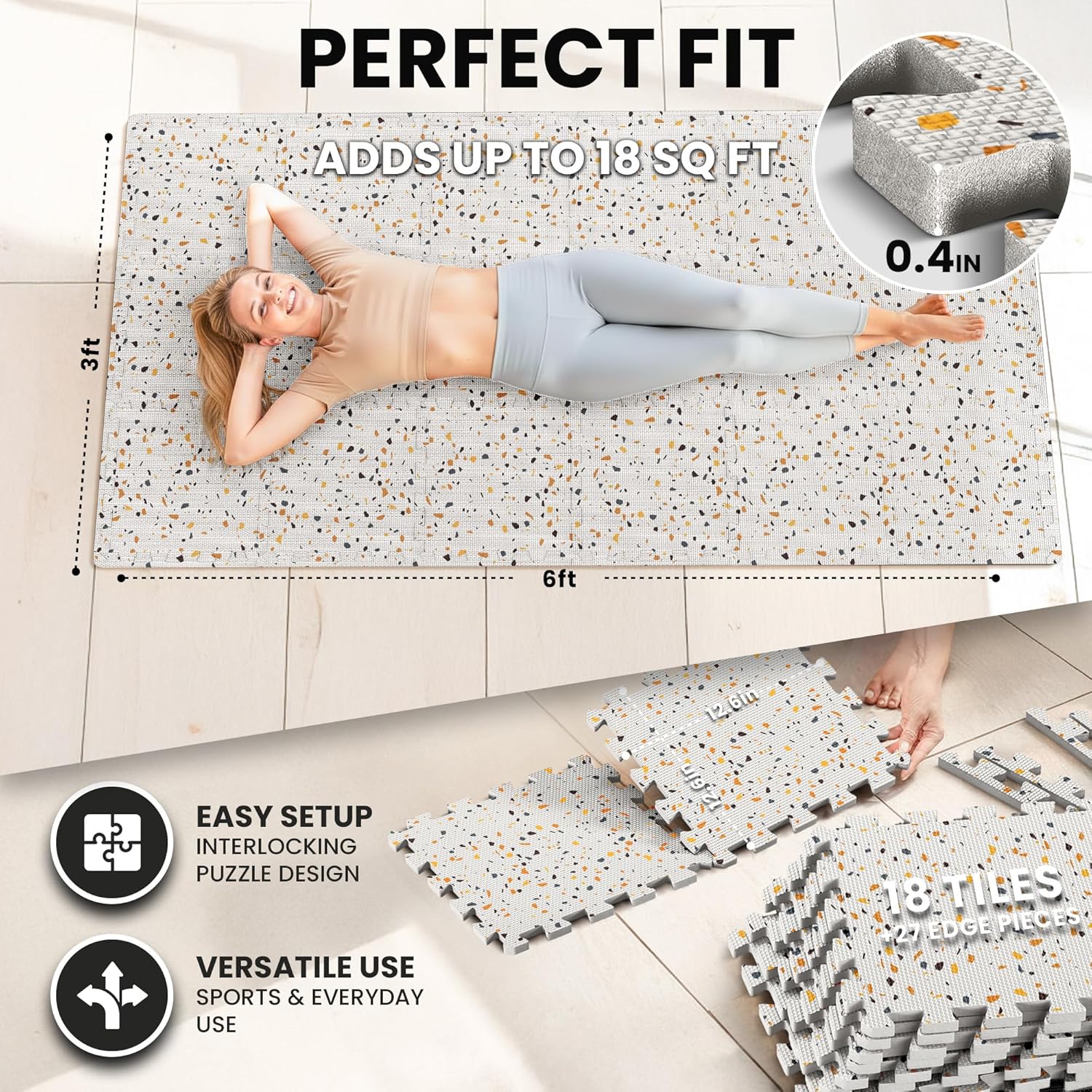 💪 𝗦𝗠𝗔𝗟𝗟𝗘𝗥 𝗠𝗔𝗧𝗦 𝗙𝗢𝗥 𝗠𝗢𝗥𝗘 𝗙𝗟𝗘𝗫𝗜𝗕𝗜𝗟𝗜𝗧𝗬 – 18 mats, with each one a size of 12.6” x 12.6” x 0.40” + edge pieces | 𝗖𝗼𝗺𝗽𝗹𝗲𝘁𝗲 𝘀𝘂𝗿𝗳𝗮𝗰𝗲 𝗮𝗿𝗲𝗮: 𝗮𝗽𝗽𝗿𝗼𝘅. 𝟲 𝗳𝘁 𝘅 𝟯 𝗳𝘁 = 𝟭𝟴 𝗳𝘁𝟮.