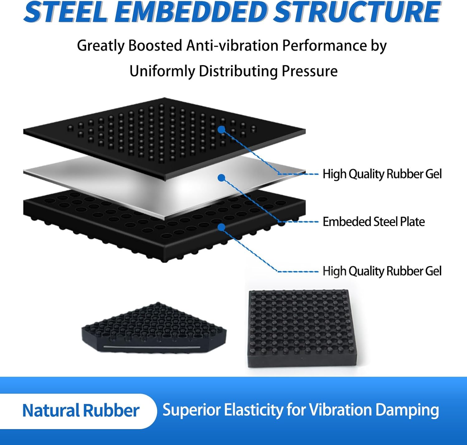 【 IMPRESSIVE SPECIFICATIONS】: Size: 4 x 4 x 0.8 inches, pack of 4; Weight: 0.52 pounds per mat; Material: Rubber with embedded steel plate; Max Load: 1000+ pounds per mat. Natural rubber is the best choice for vibration damping applications due to its superior elasticity