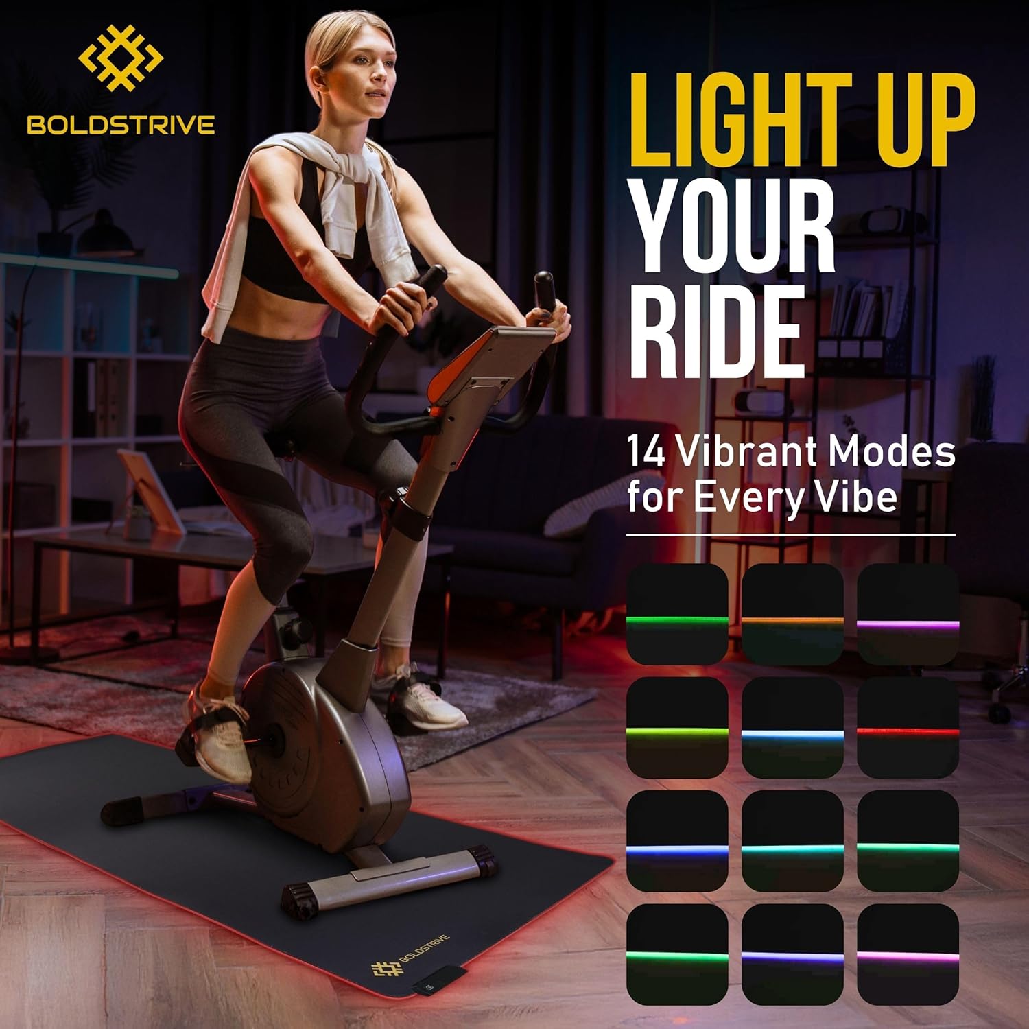 This LED indoor cycling mat enhances your workout space with vibrant RGB lighting, offering 14 modes—nine solid colors and five dynamic color-changing modes—along with two brightness levels for each. Its simple operation makes it easy to use: hold the button to turn it on or off, double-click to adjust brightness, and single-press to switch between color modes.