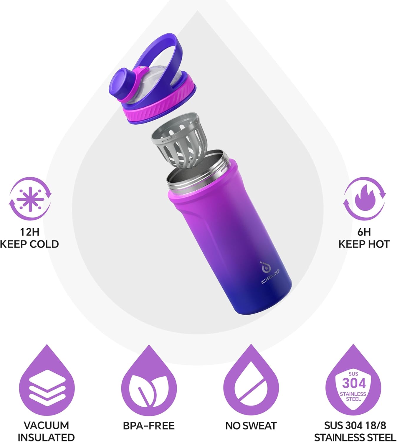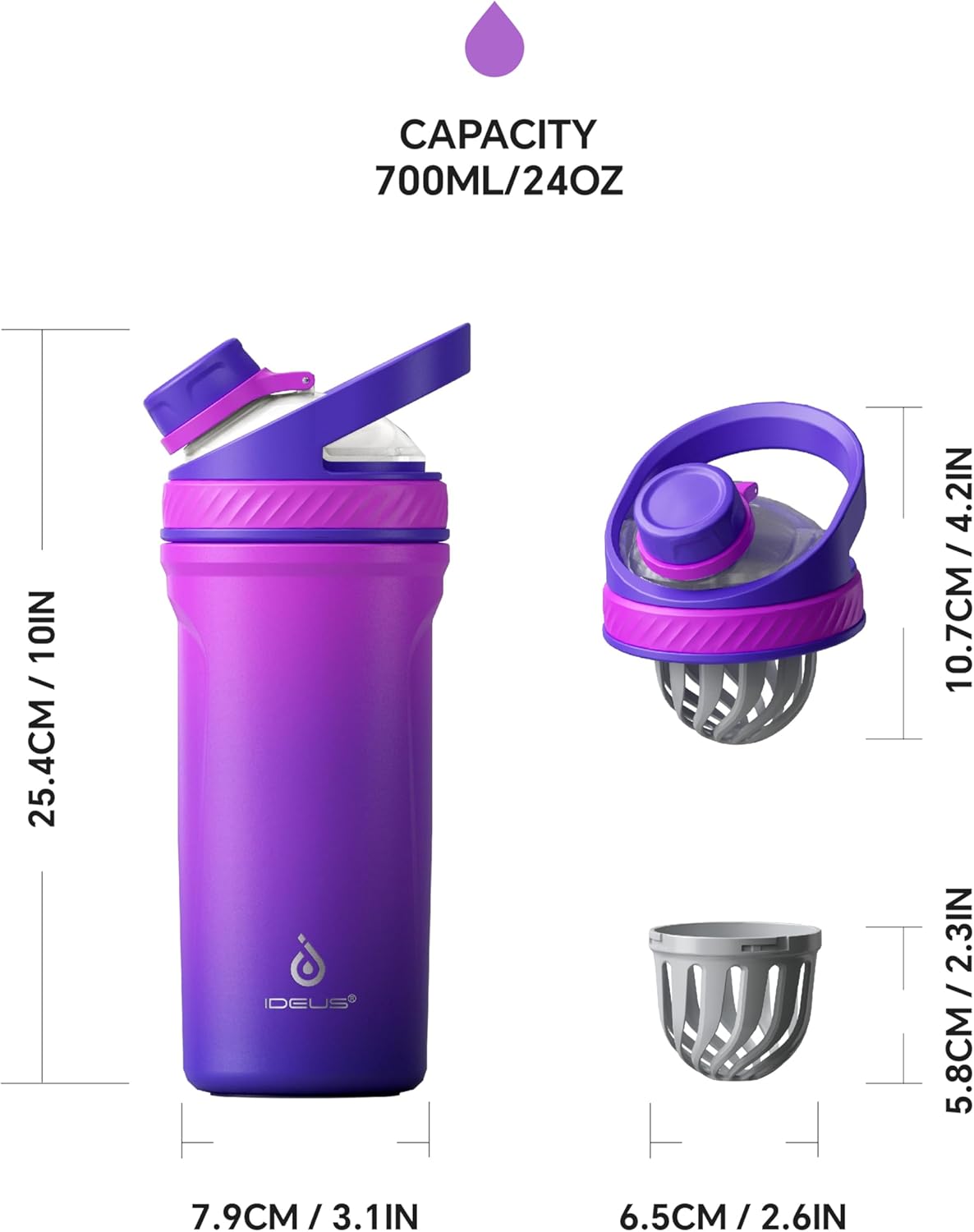 Ideus 24 oz Stainless Steel Shaker Bottle, Insulated & Leakproof Shaker Cup, BPA-Free With Silent Mixing Grate For Clump Free Shakes, Gym Essentials For Workout, Fitness, Sports, Dark Purple