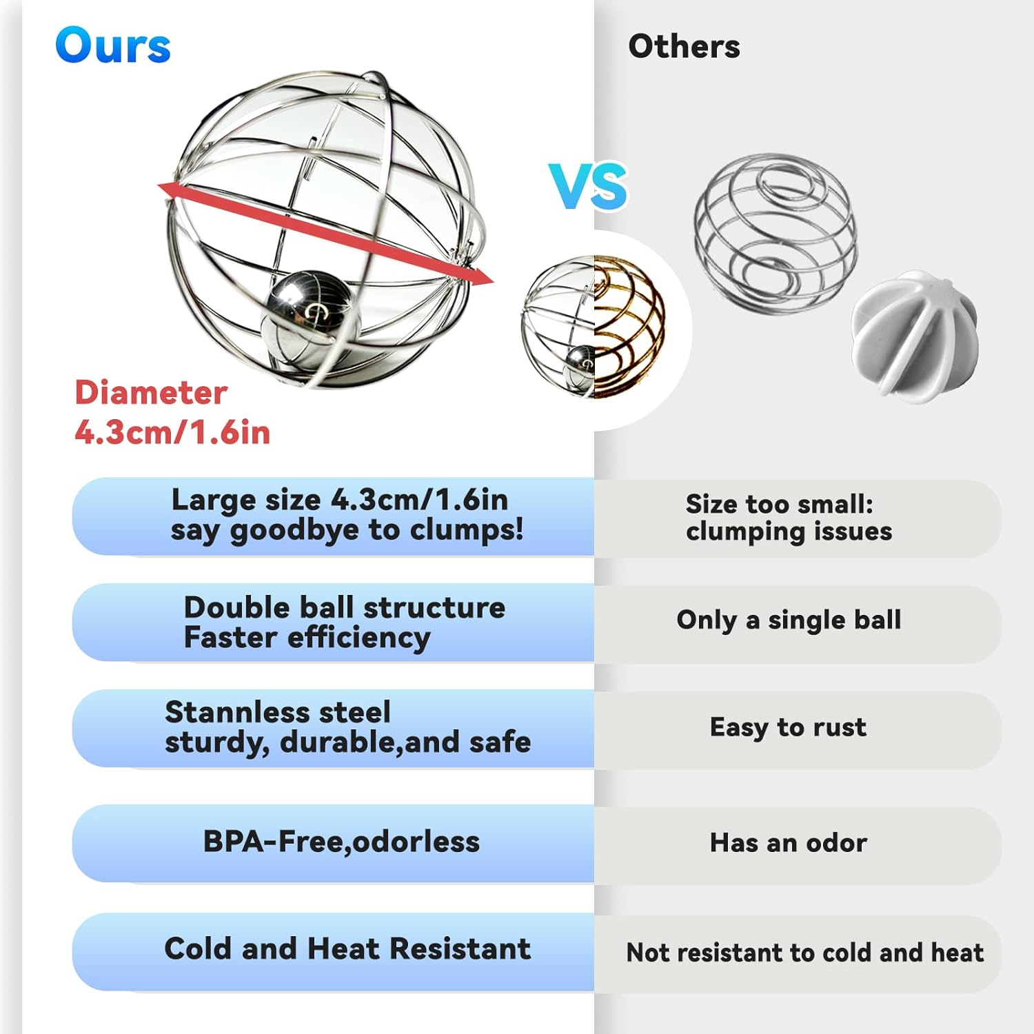 【Unique Dual Ball Structure Design】Different from the light and fluffy mesh single ball , our shaker ball is designed with a dual-layer structure, in addition to the external solid mesh ball structure , we also added a small ballinside that can move flexibly. This design allows the mixball to generate more cutting force and operate faster, saving your time and energy.