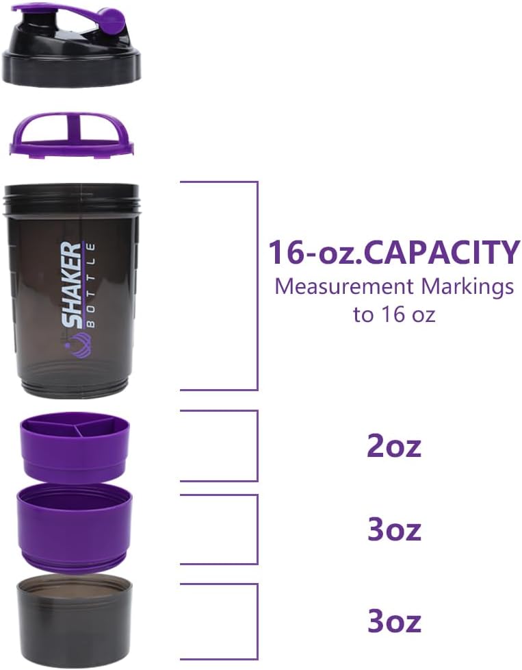 XSUPER Shaker Bottle, Leak Proof Shaker Bottle for Protein Mixes,16oz 3 Layer Twist Off Cup with Pill & Supplement Storage, Gym Sports Cup for Protein Powder, Purple