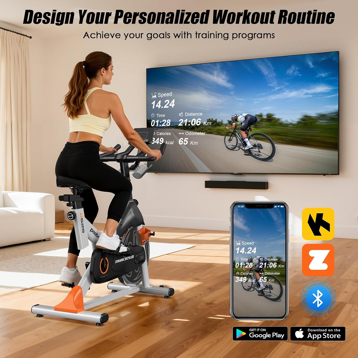 【Immersive Riding Experience with App Compatibility & Data Sync】 Transform your routine with an interactive cardio session. Our smart pooboo exercise bike connects via Bluetooth to the pooboo and FantomFite apps, displaying your real-time progress. Dive into virtual worlds with Zwift and Kinomap, and effortlessly sync your performance data with Apple Health and Google Fit to consolidate your fitness journey—all from the comfort of home.