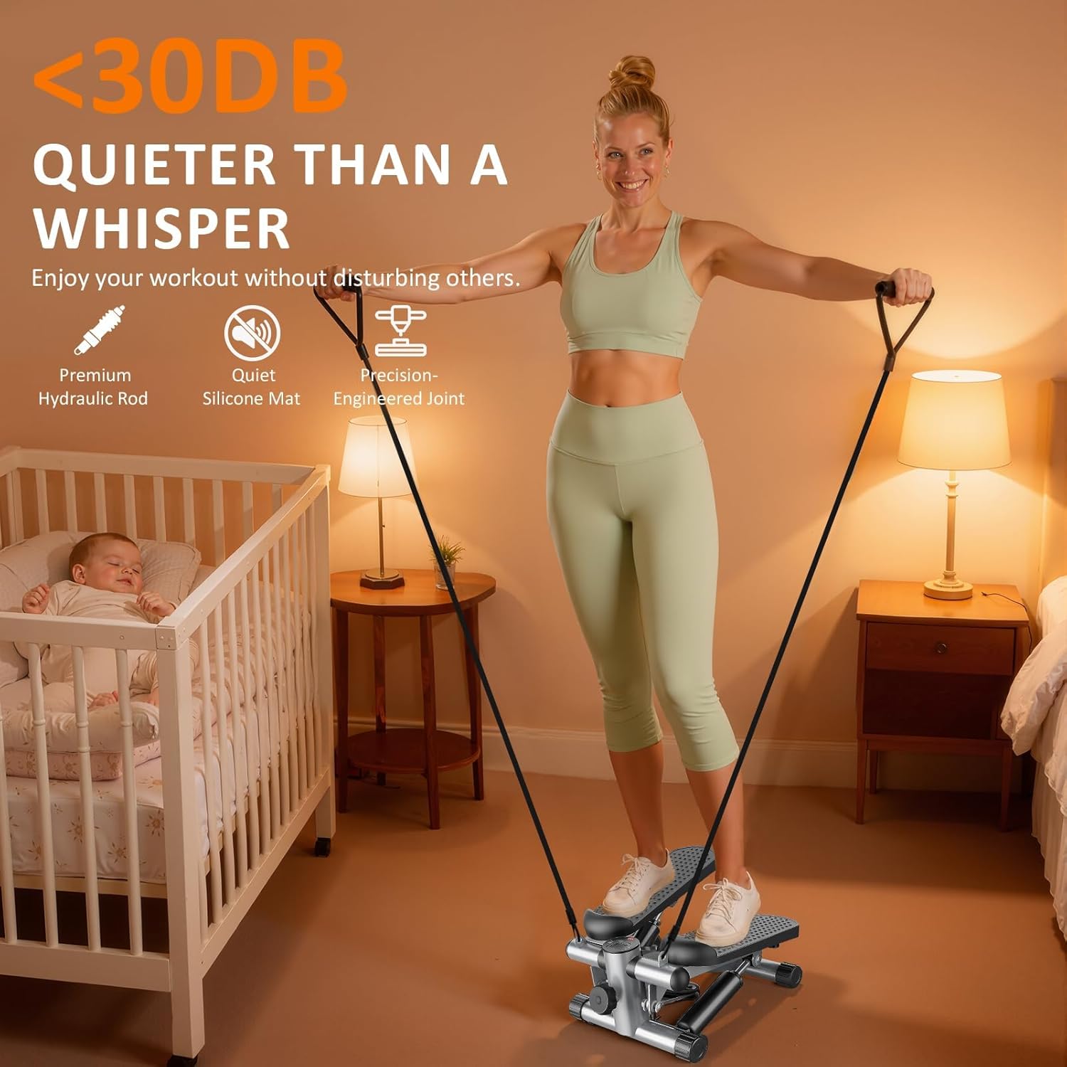 【Full-Body Home Workout Stepper】This mini stair stepper combines cardio and strength training in one compact machine. Equipped with detachable resistance bands, it allows you to tone your arms, shoulders, chest, and back while stepping to sculpt your legs and glutes. Perfect for a full-body workout at home, in the office, or in small spaces.