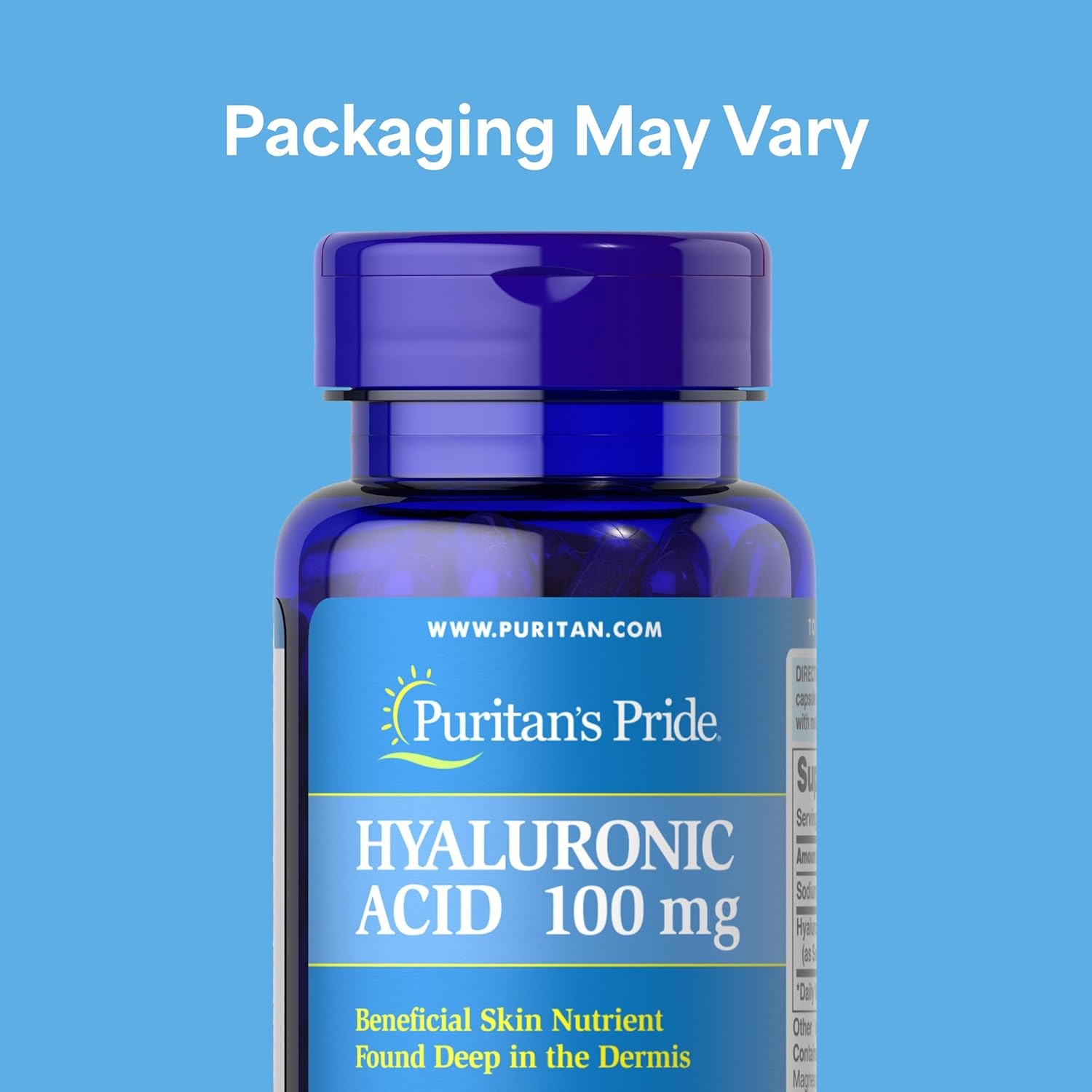 Hyaluronic Acid is a natural component found throughout your body, including your skin, joints, and bones. As we age, our production of Hyaluronic Acid decreases, but these capsules help replenish this vital nutrient. With a focus on skin hydration, our formula supports skin health, promoting a youthful appearance and overall well-being. * Manufactured in the United States with high-quality ingredients from around the world, Puritan’s Pride 100 mg Hyaluronic Acid helps you feel your best, inside and out. * *These statements have not been evaluated by the Food and Drug Administration. This product is not intended to diagnose, treat, cure or prevent any disease. (Packaging May Vary)