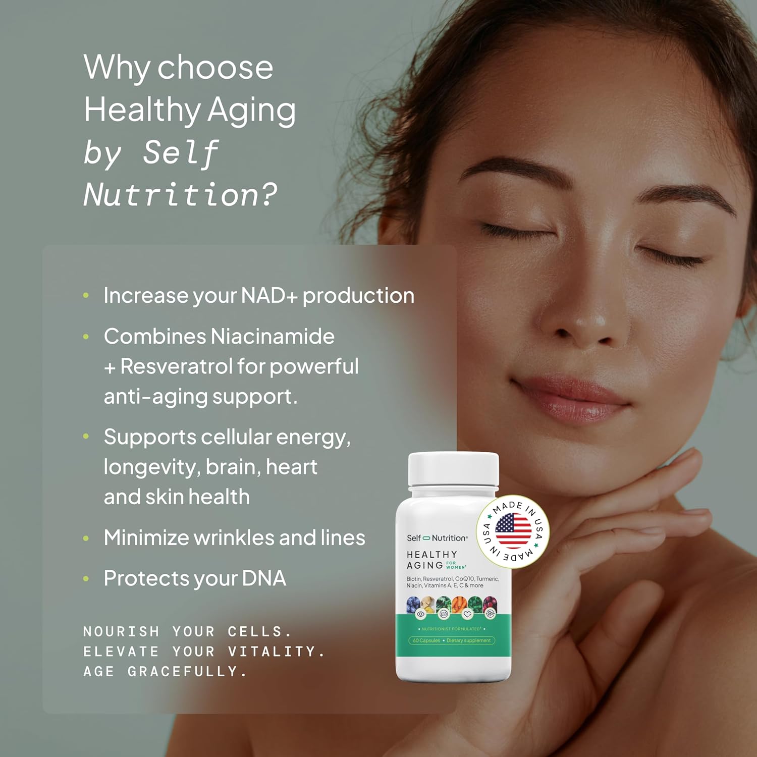 SELF NUTRITION Healthy Aging Supplement for Women – NAD+, Resveratrol, Collagen Booster, Biotin, Hyaluronic Acid & More. Cellular Energy, Healthy Aging, Skin Support – USA, Vegan, 60 Capsules.