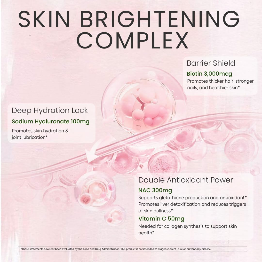 Start Your Glow Journey: Multiple Nutrients support Women’s Skin & Beauty with NAC (300mg), Sodium Hyaluronate (100mg), Vitamin C (50mg), and Biotin (3,000mcg).