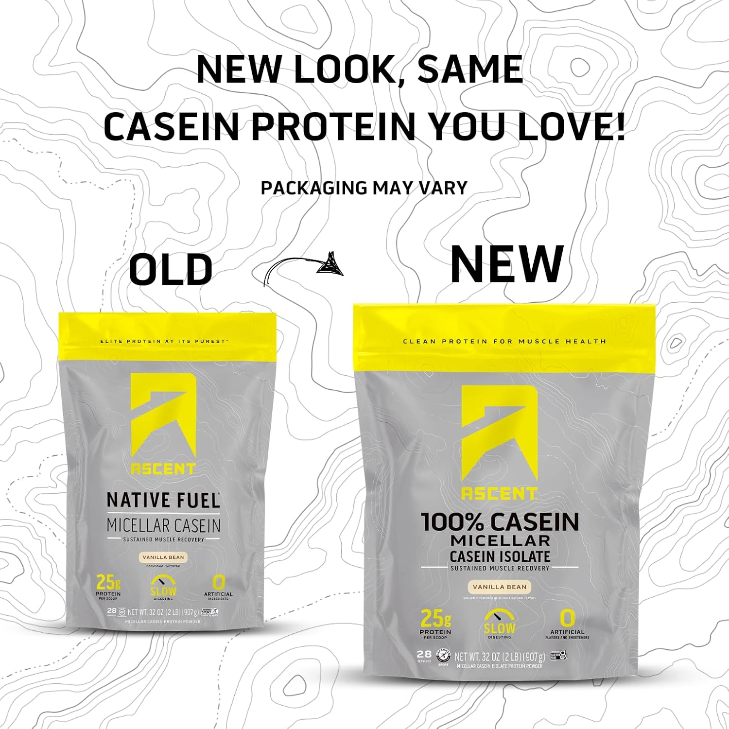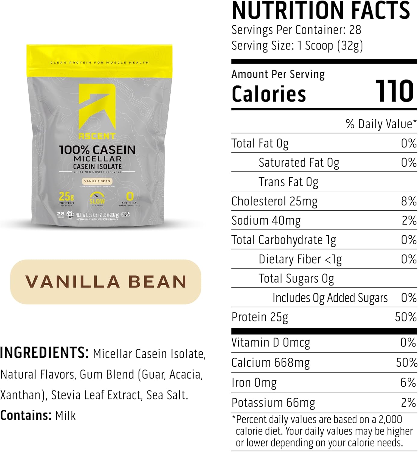 Ascent Casein Protein Powder – 25g Micellar Casein Powder with Zero Artificial Flavors & Sweeteners, Gluten-Free, No Added Sugar, 4.9g BCAA, 2.2g Leucine – Vanilla Bean, 2 Pounds