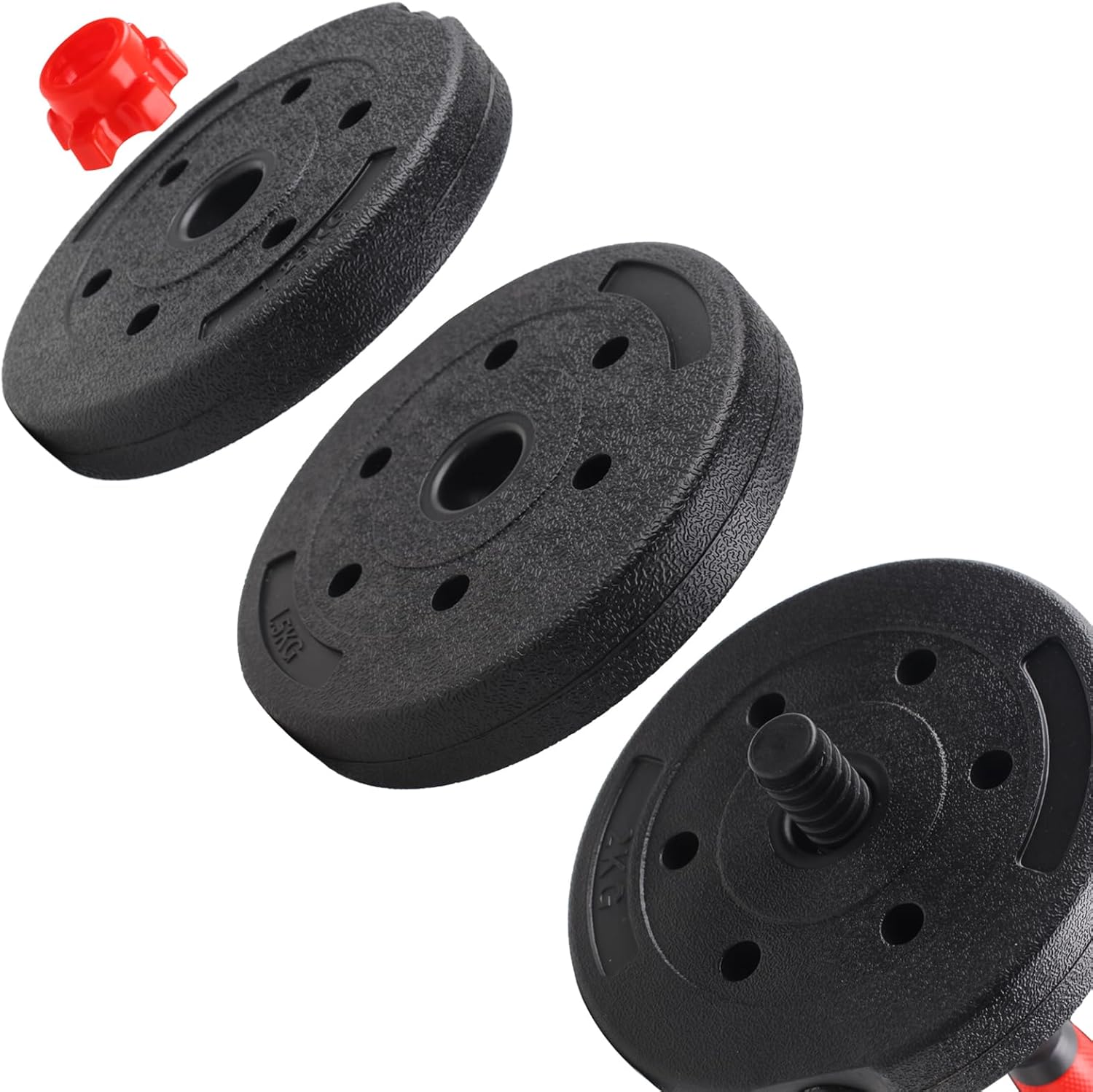 MULTIPLE WEIGHT OPTIONS: Package includes 4 pcs 1.25KG/2.75LB weight plates, 4 pcs 1.5KG/3.3LB weight plates, 4 pcs 2KG/4.4LB weight plates, 2 pcs dumbbell bars, 4 pcs spinlock collars and a barbell connecter.