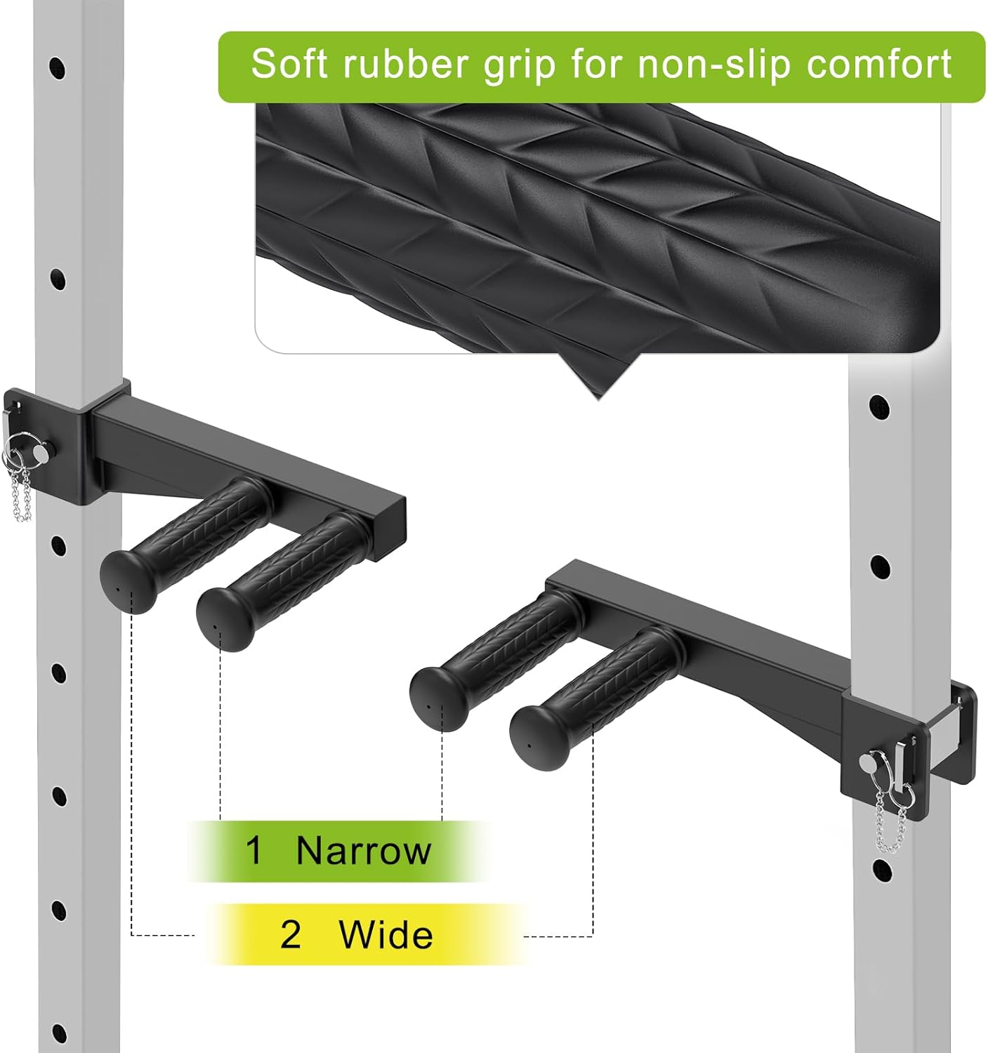 【WIDE & NARROW GRIPS】Choose between wide grip dips for chest or narrow grip dips for tricep. Fit all wide and narrow shouldered users. Handle soft rubber wrapped for non-slip comfort, perfect for dip, inverted row, pull up, push up, and more
