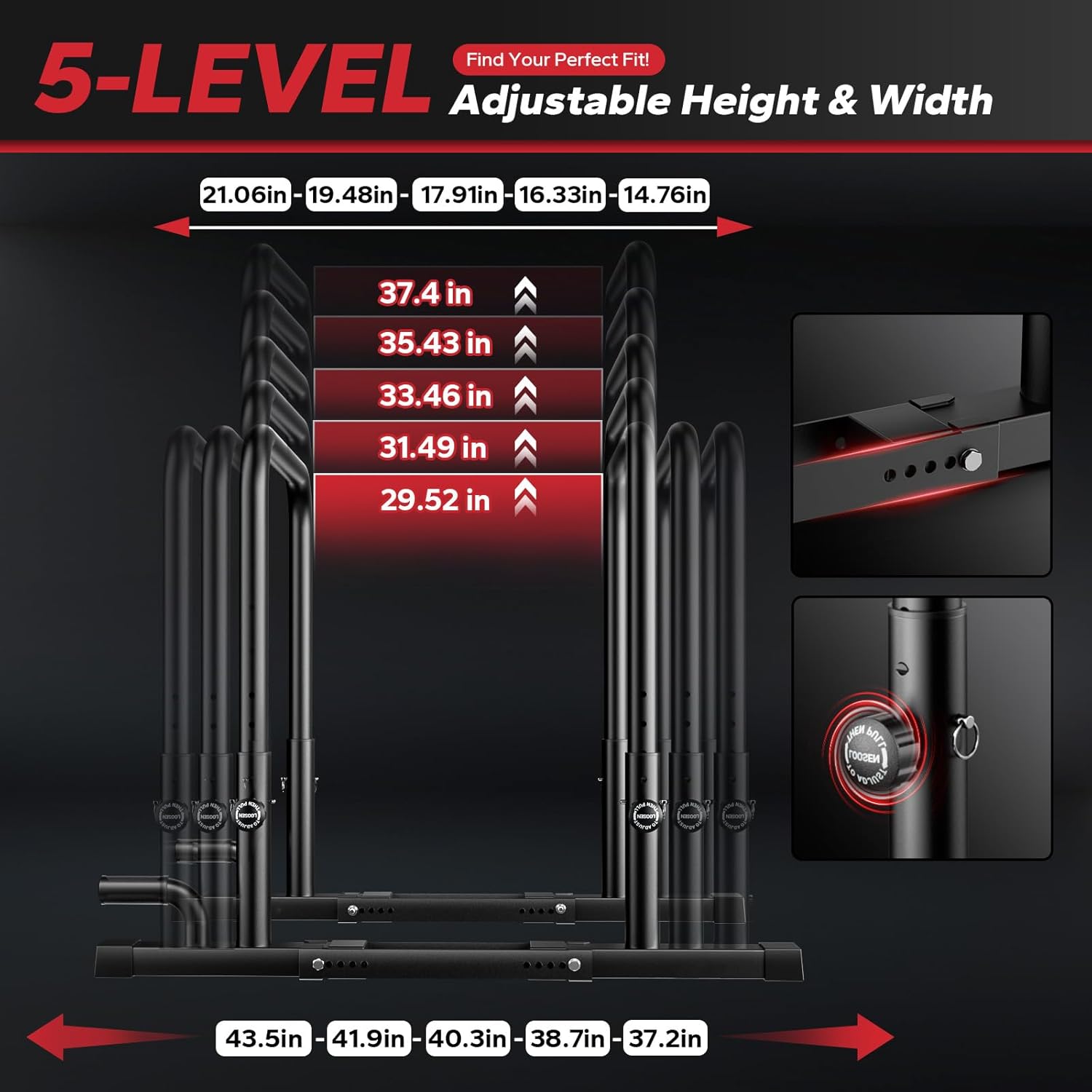 【Adjustable for Versatile Workouts】Parallel bars feature 5 adjustable levels for both height (29.52in-37.4in) and width (14.76in-21.06in), easily adapting to users of different heights and workout goals. Compatible with dips, leg raises, pull ups, planches & more. We’ve added extra push up bars (a handy enhancement for most standard dip bars for home) to support push-ups. Target chest, arms, core, shoulders, back and muscles effectively with dip station.