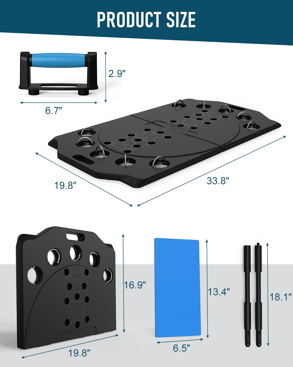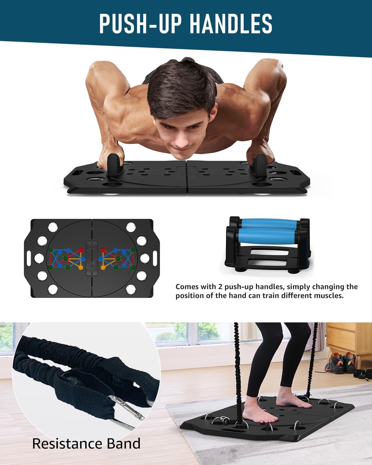 You Can Get: 1*push-up board, 2*push-up handles, 4*resistance bands, 2*exercise handles, 2*wristbands,1*door anchor, 2*sponge pad, 1*instruction manual.
