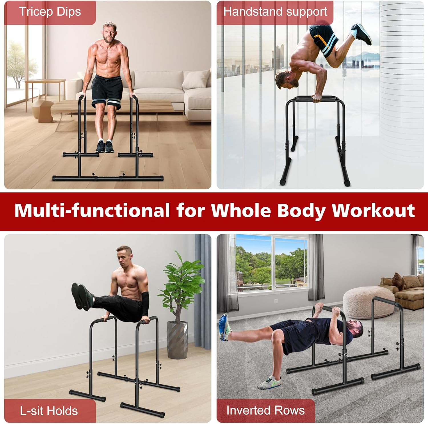 【Multiple Function】The parallel bars can be used for multiple exercises that are beneficial to strength training such as chest dips, pull-ups, hanging leg, and calisthenics. As simple home gym equipment, it is supposed to effectively work out your arms, chest, shoulders, back, and more. Ten minutes a day, eliminate obesity, increase muscle strength, relieve pain, and shape a perfect body.