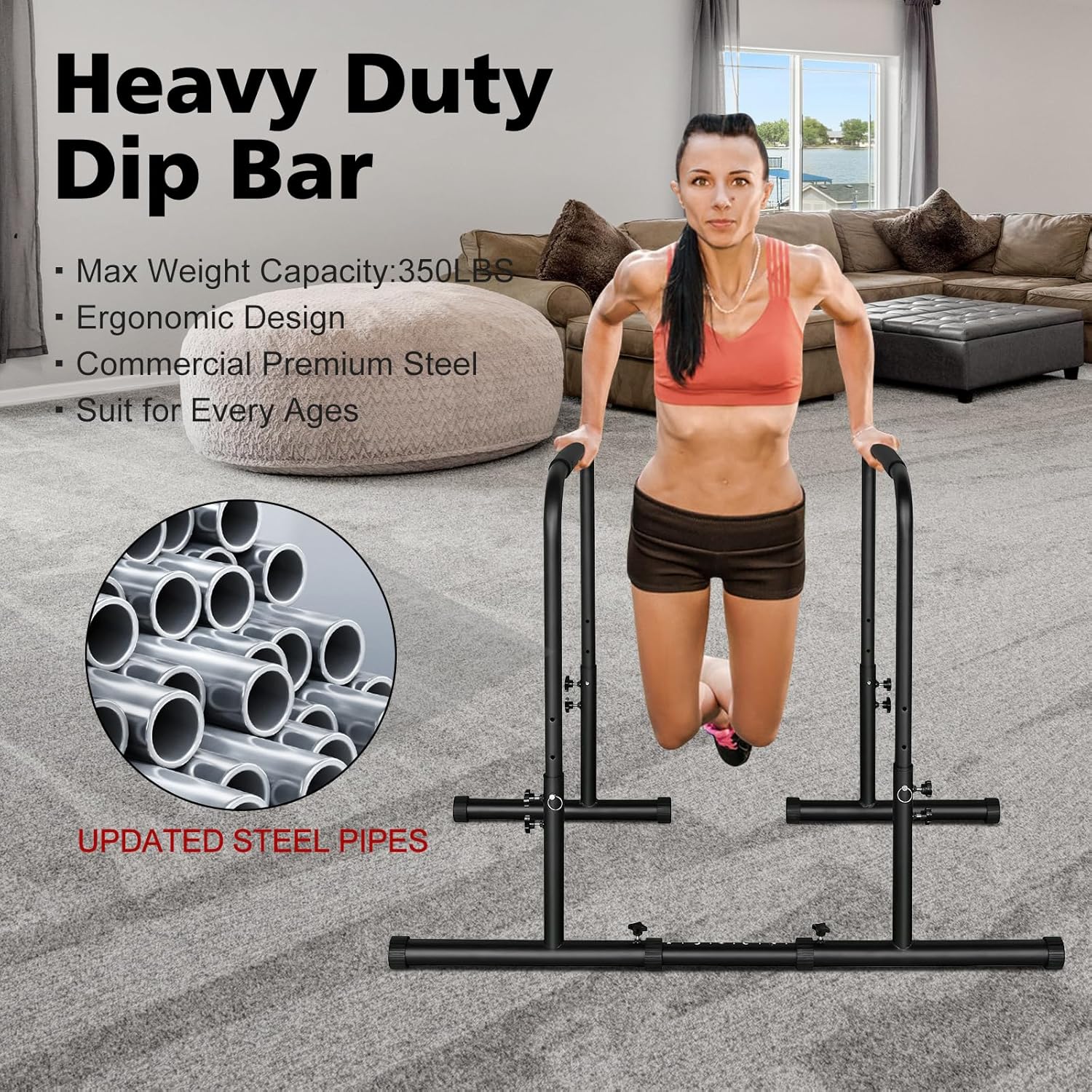【Sturdy Construction】Our heavy duty steel construction Dip stands is made of high-quality steel pipes, which has 350LBS weight capacity and double safety connector. Non-slip and wear-resistant rubber feet for firm positioning to keep you safe, prevent slipping and wobbling while preventing damage to the floor.