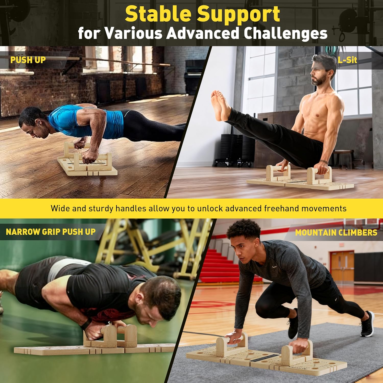 Crafted from carefully selected premium natural pine wood: Push-up board is untreated with paint and devoid of unpleasant smells, retaining the wood’s original texture and grain for a child-friendly use. The main body is finely sanded to a smooth, burr-free finish, paired with four non-slip foot pads made of high-elastic rubber that grip firmly on various surfaces including tiles, wooden floors and cement ground. Boasting a load capacity of up to 450lbs, it remains stable without warping or cracking over long-term use. The ergonomically designed handle features no rubber or metal fittings, offering a skin-friendly grip that eases wrist strain even during extended workouts.