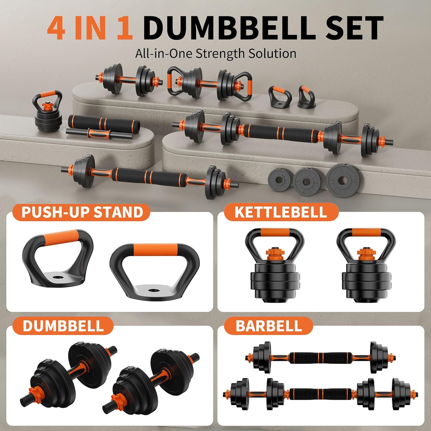 【4-in-1 Full-Body Versatility】Transform your routine with ease—switch between dumbbells, barbell, kettlebell, and push-up stand to train chest, legs, back, arms, and more. One set, endless possibilities for men & women.