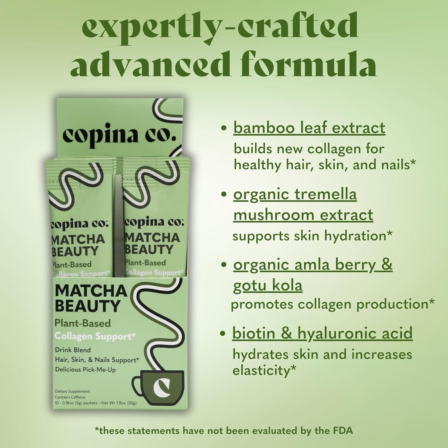 PLANT BASED GOODNESS. All Copina flavors are vegan, non-GMO and sugar free. Nourish yourself with our blend of skin-boosting research-backed plant botanicals sourced and dosed by herbalists along with organic coconut and rice milks. Each serving also includes biotin, bamboo leaf extract, organic tremella mushroom fruiting body extract, gotu kola whole plant extract, and amla berry.