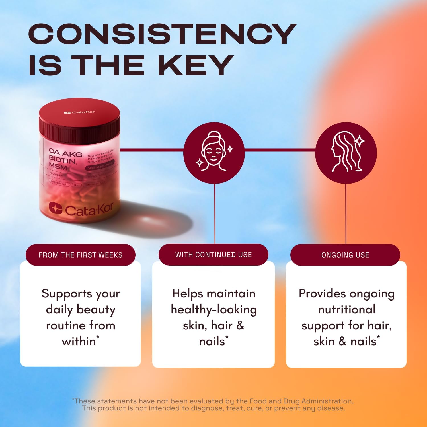 CATA-KOR BEAUTY COMPLEX formulated with Calcium AKG, MSM, Hyaluronic Acid, Biotin, Zinc supplements to support skin elasticity, promote shiny hair & strong nails.*