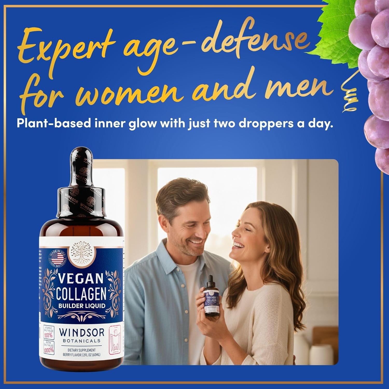 VEGAN COLLAGEN BUILDER. Plant-based liquid collagen for women and men with Vitamin C, Biotin, Hyaluronic Acid, and amino acids to support natural collagen production, energy, and vitality.