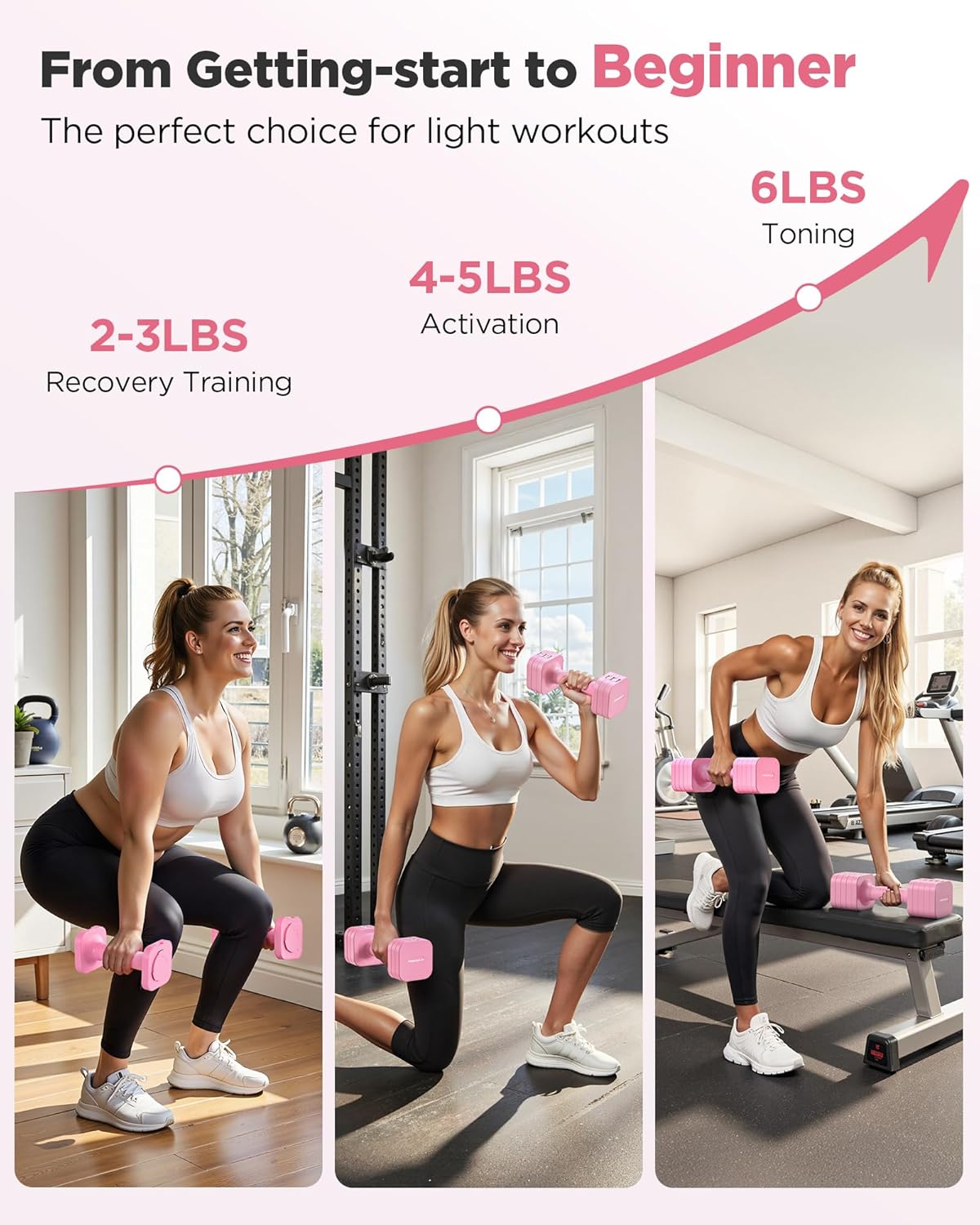 【Train Every Muscle Group】Target your arms, shoulders, core, glutes, and legs with one versatile dumbbell set. The 2/3/4/5/6 lbs weight options allow precise control for both isolation moves and full-body exercises, helping you build strength, improve muscle tone, and enhance overall body balance.