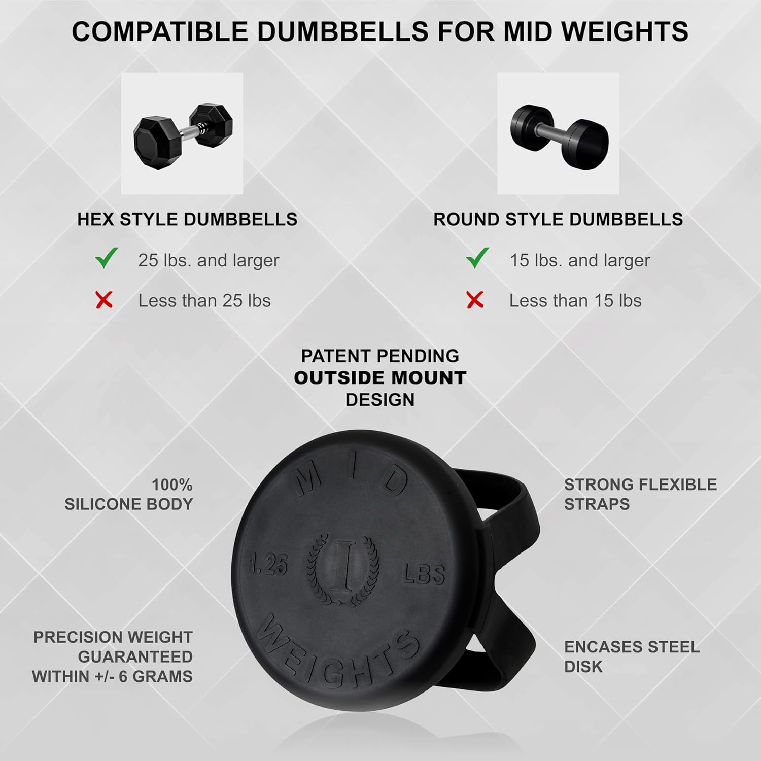 TIGHT & STABLE GRIP: Unlike using weight clips for dumbbells to add weight, mid weights feature a patent pending design that mounts the 1.25 lb plates on the outside of the dumbbell, freeing your hand from obstructions. Also unlike magnetic weight plates or clip on weights, mid weights allow complete exercise selection.