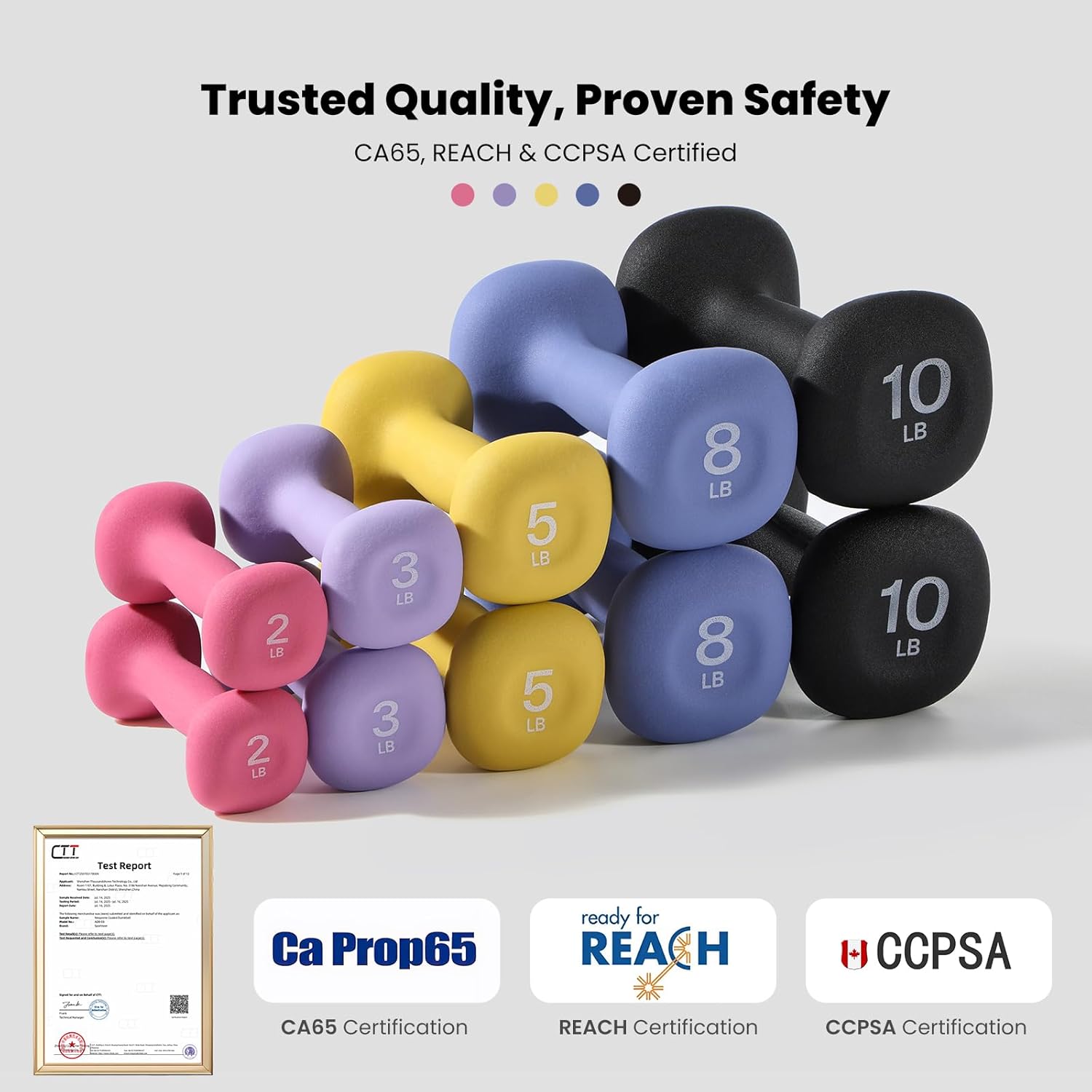 Say Goodbye to Unpleasant Odors: Made from non-toxic neoprene, these exercise dumbbells are odor-free and CA65 certified, ensuring a safe, healthy workout experience.