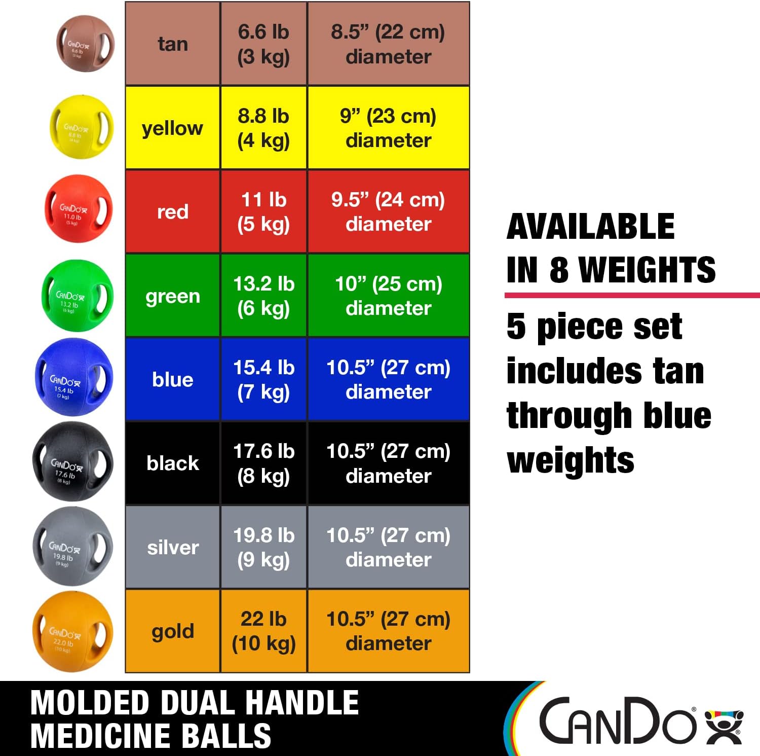 CanDo Molded Dual Handle Medicine Ball – 5 pc Set (Tan, Yellow, Red, Green, Blue)
