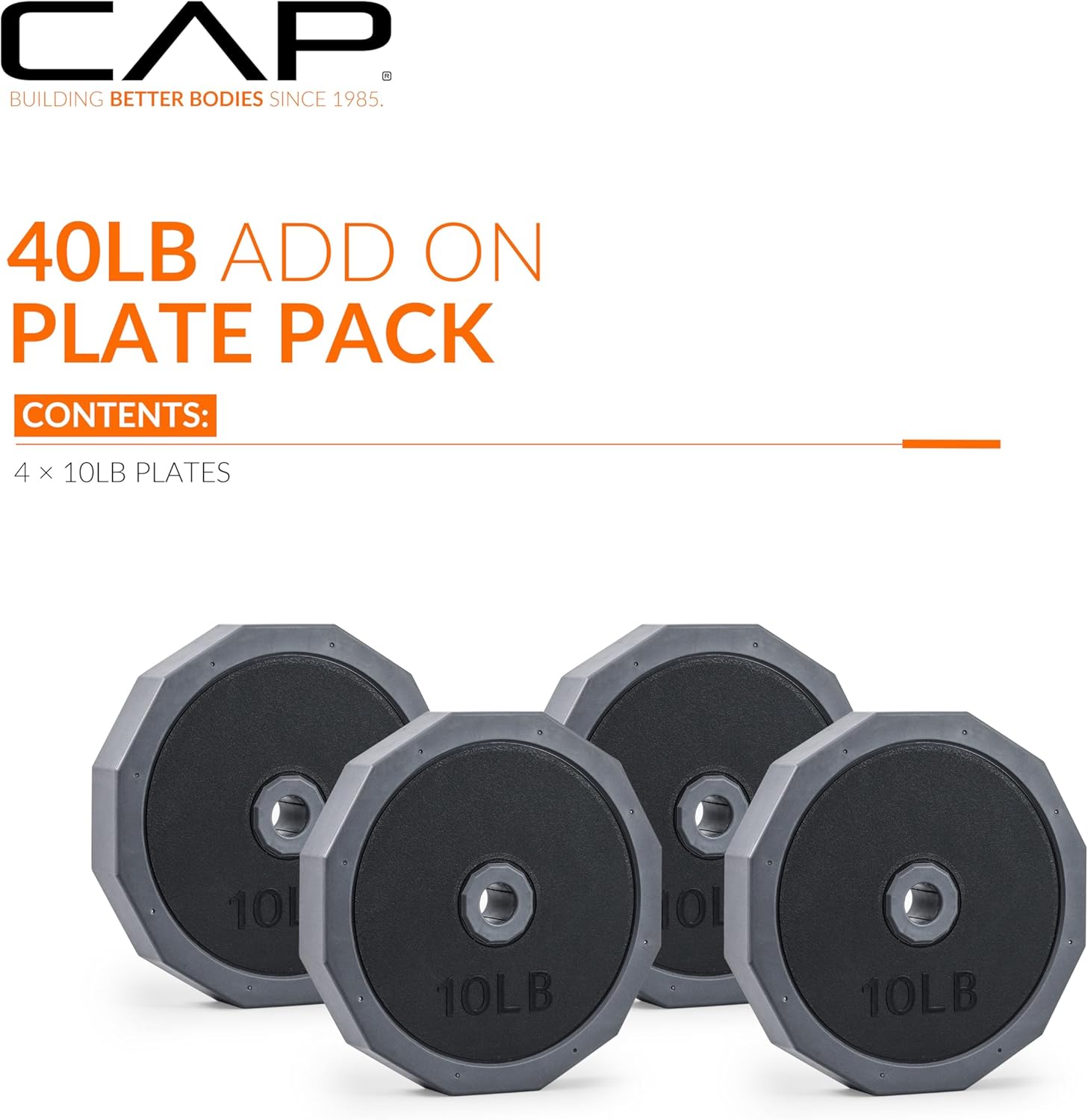 Expand your training options with the CAP Barbell 40 LB Add-On Plate Pack, designed to enhance your adjustable dumbbell or barbell setup. This set includes four 10 LB standard plates featuring a durable TPR-coated exterior and iron sand filling for long-lasting performance. Each plate has a 1-inch center hole, making it compatible with most standard bars, handles, and CAP adjustable sets. Use this plate pack to add resistance to your workouts or pair it with the CAP 45LB Adjustable Multi-Use Set to build an 85 LB barbell (set sold separately). Ideal for strength training, toning, and progressive overload, this compact add-on set helps elevate your home workout routine.3