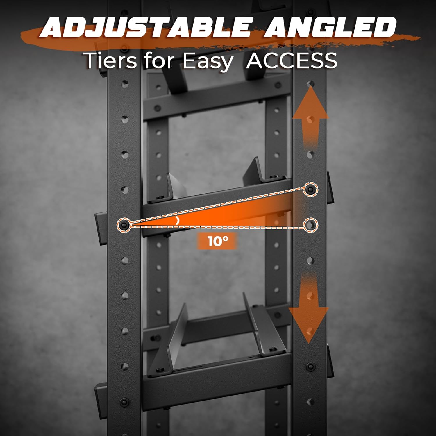 【FITS ALL SIZES OF DUMBBELLS】Each tier of our dumbbell stand comes pre-drilled with two screw holes and features a built-in fully adjustable slide rail, so you can dial the bar spacing anywhere from 3.35″ to 6.5″. This flexible setup keeps dumbbells, kettlebells, plates, and other gear locked in place—no more cluttered floor or wasted space.