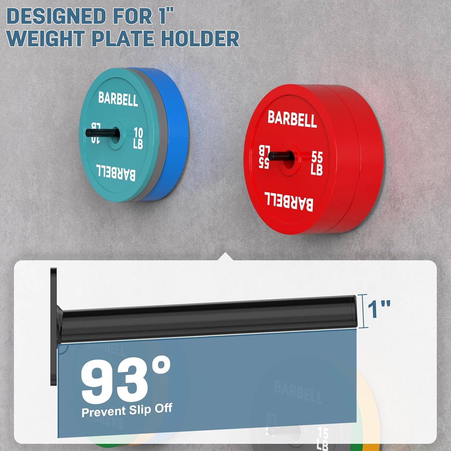 Easy Installation for 1-Inch Olympic Plates: This 1 inch weight plate holder model includes a complete hardware kit for secure mounting; The wall mounted weight plate holder 1 inch comes with upgraded screws for wooden studs and concrete walls; Please note: For safety, this wall mounted weight plate holder should not be installed on drywall alone