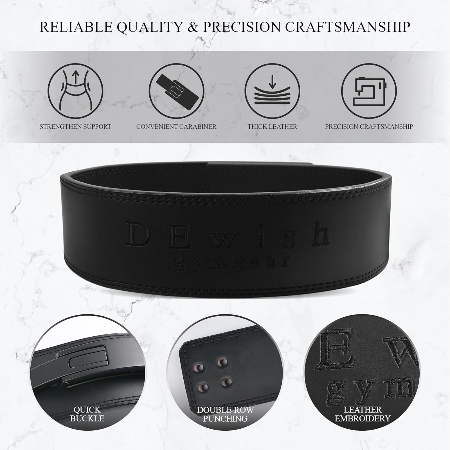This lever weight lifting belt features a surface made of genuine leather, with an interior crafted from microfiber leather and a suede lining. The lever gym belt utilizes double-needle stitching technology, combining aesthetics and comfort. This fitness belt ensures durability and long-lasting performance