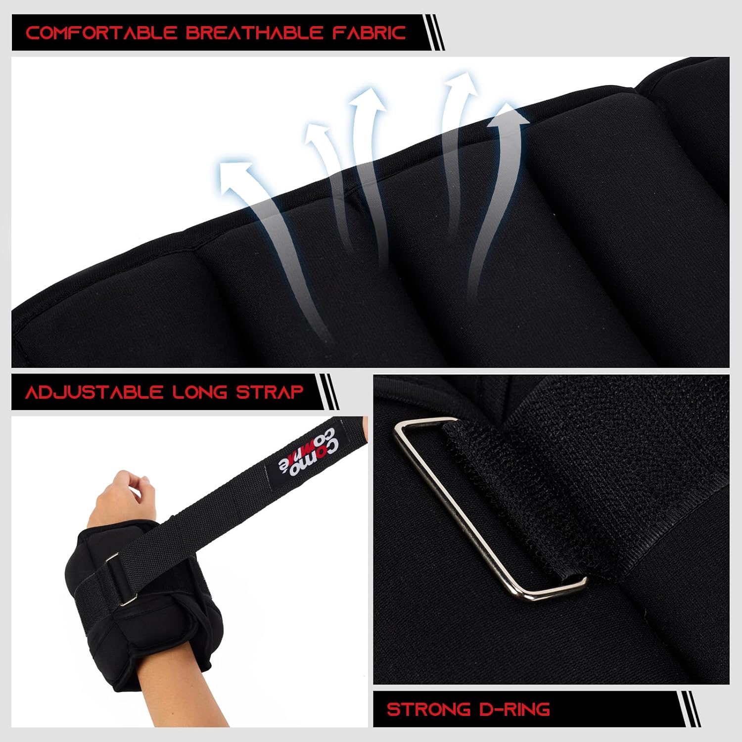 Material And Comfortable: The Comocomme wrist weights were made of neoprene exterior and moisture absorbing material inside, soft, breathable and comfortable to wear
