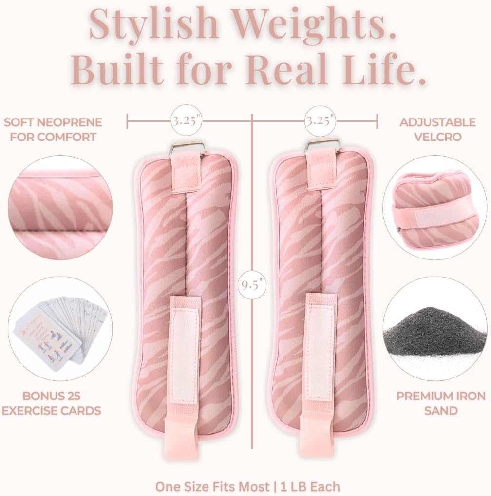 Stylish & Functional Wrist And Ankle Weights: Upgrade your workout essentials with these chic pink zebra print wrist weights and ankle weights. Perfect for yoga, Pilates, barre, strength training, and walking, these sleek 1 lb weights add resistance to tone arms and legs while doubling as stylish fitness accessories for women.