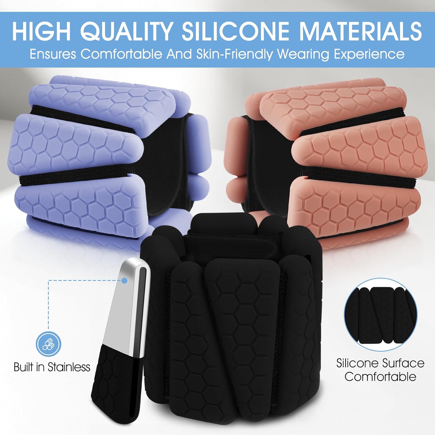 【HIGHT-QUALITY】: Our adjustable wrist weights sets made of soft and comfortable silicone material, providing a skin-friendly, sweat and waterproof wear. Unique triangle design can make it bend freely, and the stainless steel material inside can ensure enough exercise load under the premise of free bending. Each triangle load can move freely, allowing you to adjust the weight of bracelets, you can remove a section load to create a better fit, make you more comfortable to enjoy sport.
