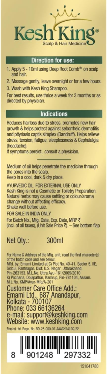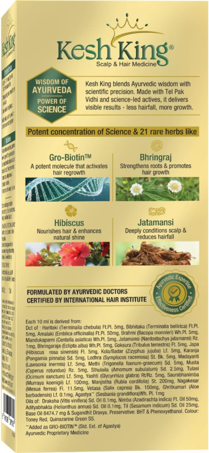 Kesh King Ayurvedic Scalp & Hair Oil is a proprietary medicinal preparation to reduce hair fall and increase the growth of new hair. It is a natural and herbal oil consisting of 21 Ayurvedic herbs like Bhringraja which enhance hair growth. Amalki which gives strength to hair, Methi which prevents hair loss, Jatamansi which prevents greying of hair, etc. Kesh King is clinically proven to be 2X more effective than other ayurvedic oils and presents as a complete hair care solution by reducing hair fall, enhance the growth of new hair, reduces dandruff, and prevents greying of hair. It comes with a root comb for deeper and proper application of hair oil. Visible results can be seen with regular use of Kesh King Hair Ayurvedic Hair Oil for 3 months.