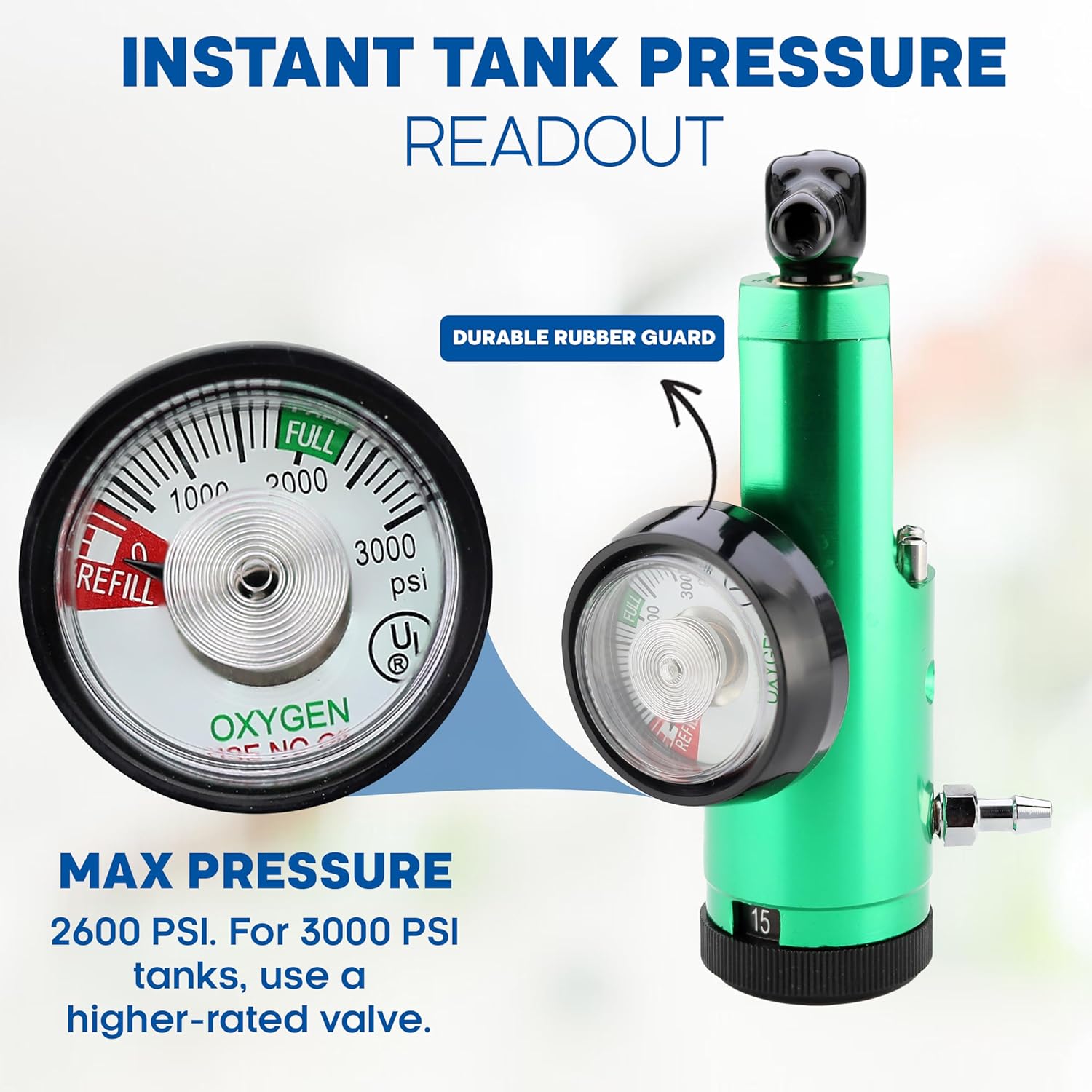 𝗘𝗔𝗦𝗬-𝗧𝗢-𝗥𝗘𝗔𝗗 𝗚𝗔𝗨𝗚𝗘: Monitor oxygen usage effortlessly with the clear gauge with this oxygen regulator for oxygen tank. This displays accurate LPM flow and remaining oxygen in the cylinder for safe and efficient therapy management.