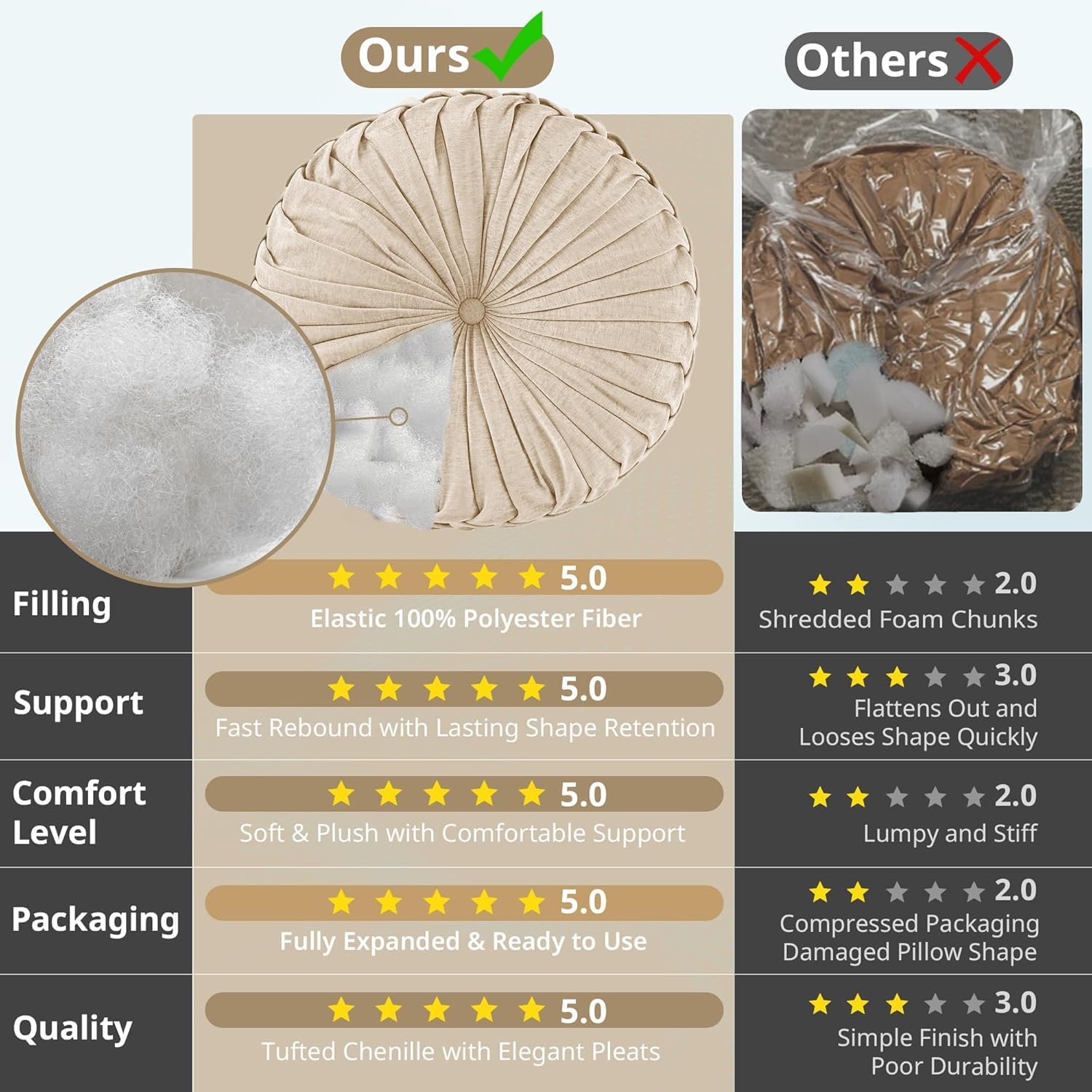 Sizes & Packaging – Round: 20″W x 20″L x 5″H. Square: 22″ Diameter x 6″H. Both arrive in non-compressed packaging, fully expanded and ready to use—no fluffing required for Azza; occasional fluffing may be needed for Loretta to maintain fullness
