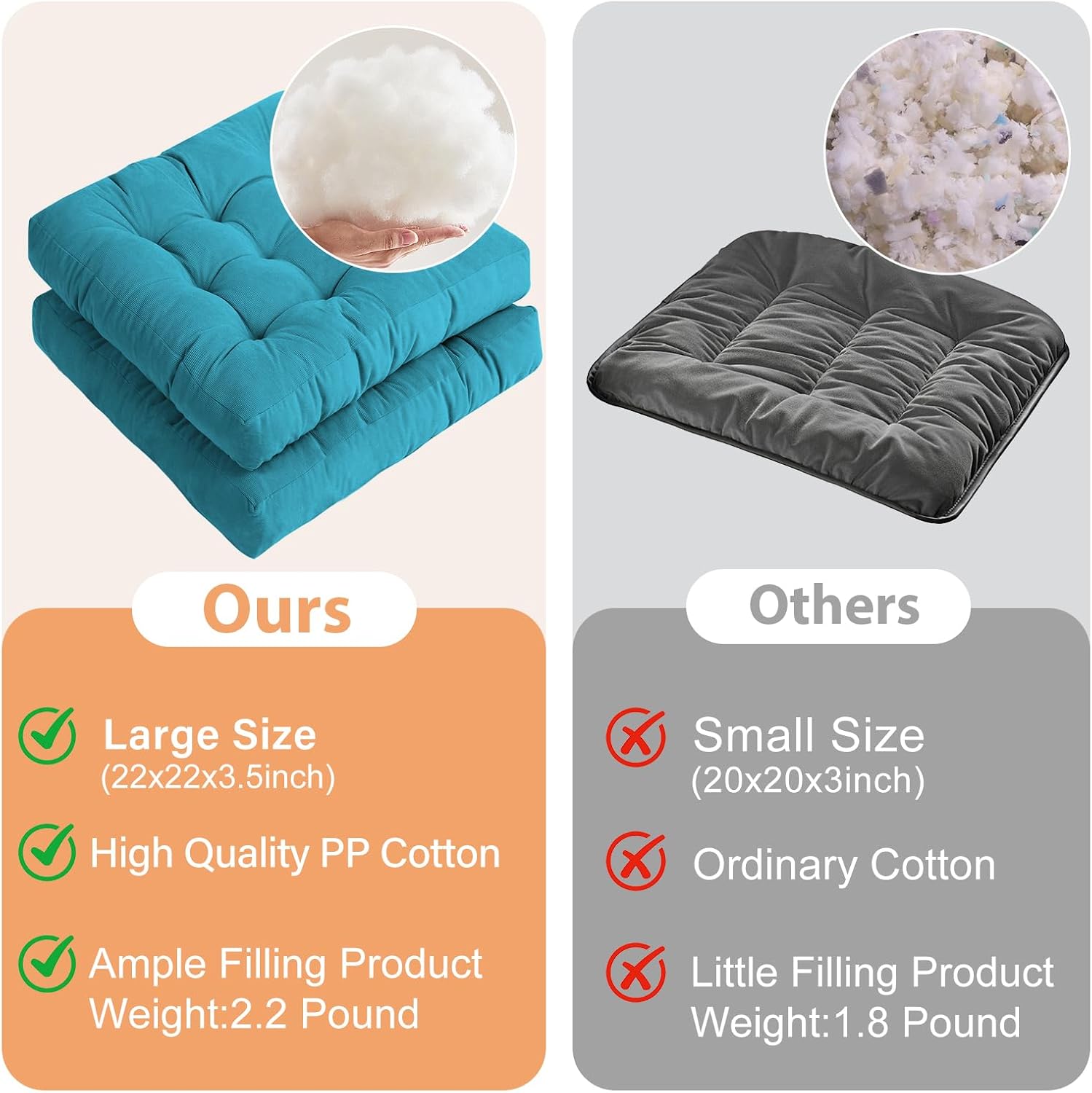 【SIZE】Patio Chair Cushion dimensions are 22x22x4 inch (2 Pack). Tips: Please note the round chair cushins were packed with compress bag due to long shipment. Please put the floor seat cushion exposing under the sunlight for a few hours, then the chair cushion will recover to the normal thickness soon.