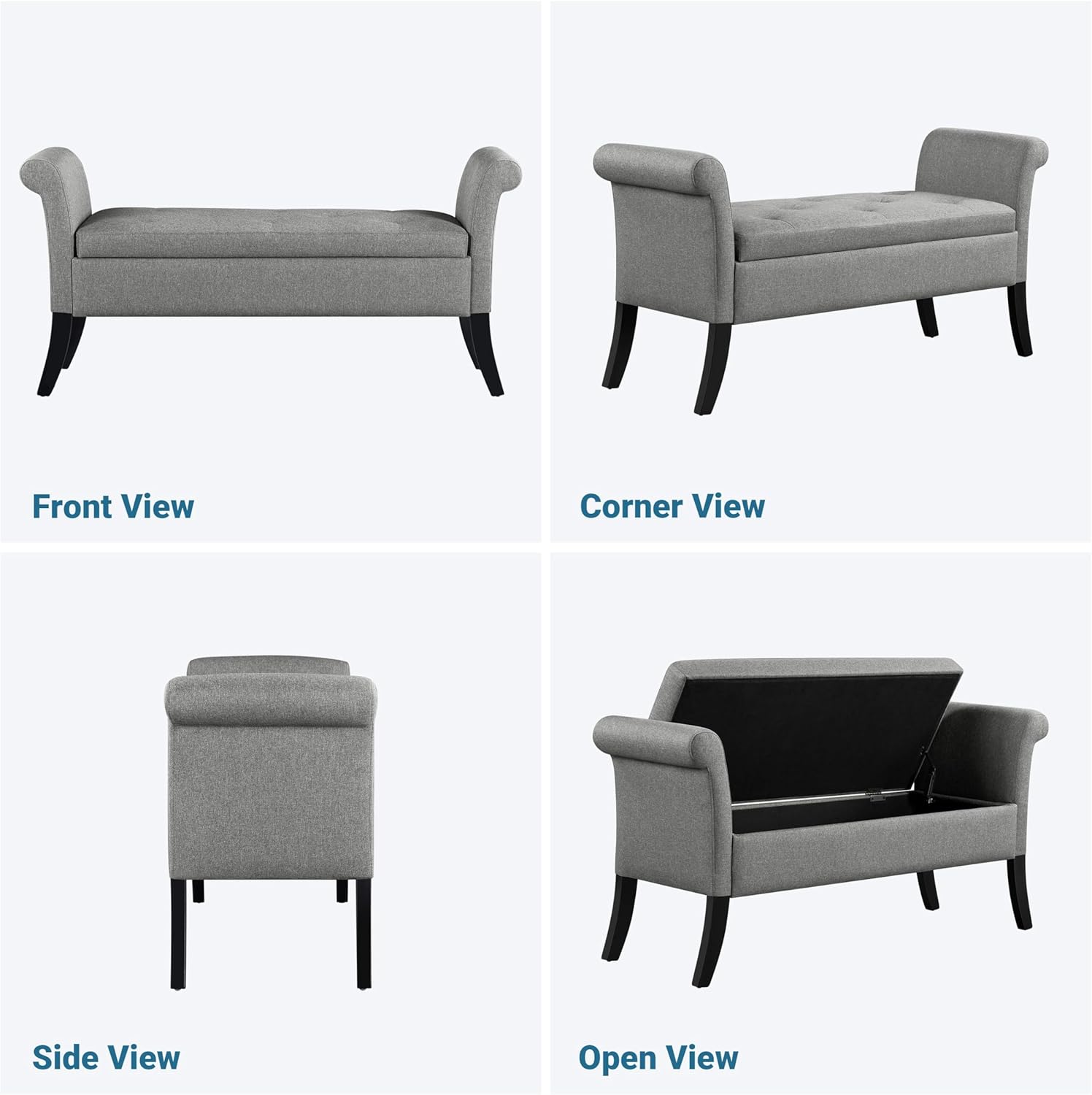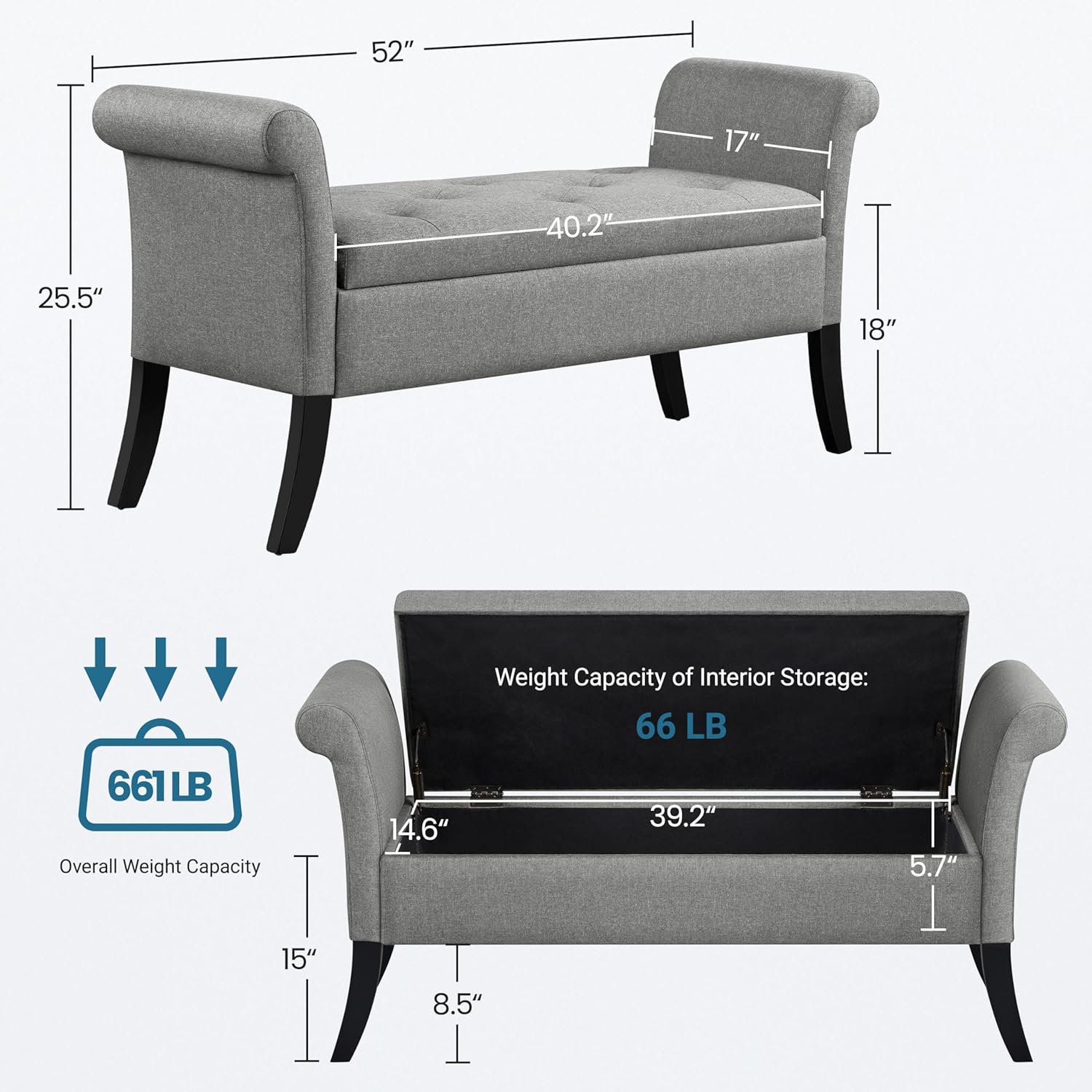 Sturdy & Stable: Constructed with solid pine wood and CARB P2 MDF board and supported by solid pinewood legs, this storage bench can hold up to 661 lb in total. Slanted pinewood legs make this fabric-tufted storage bench firm and stable