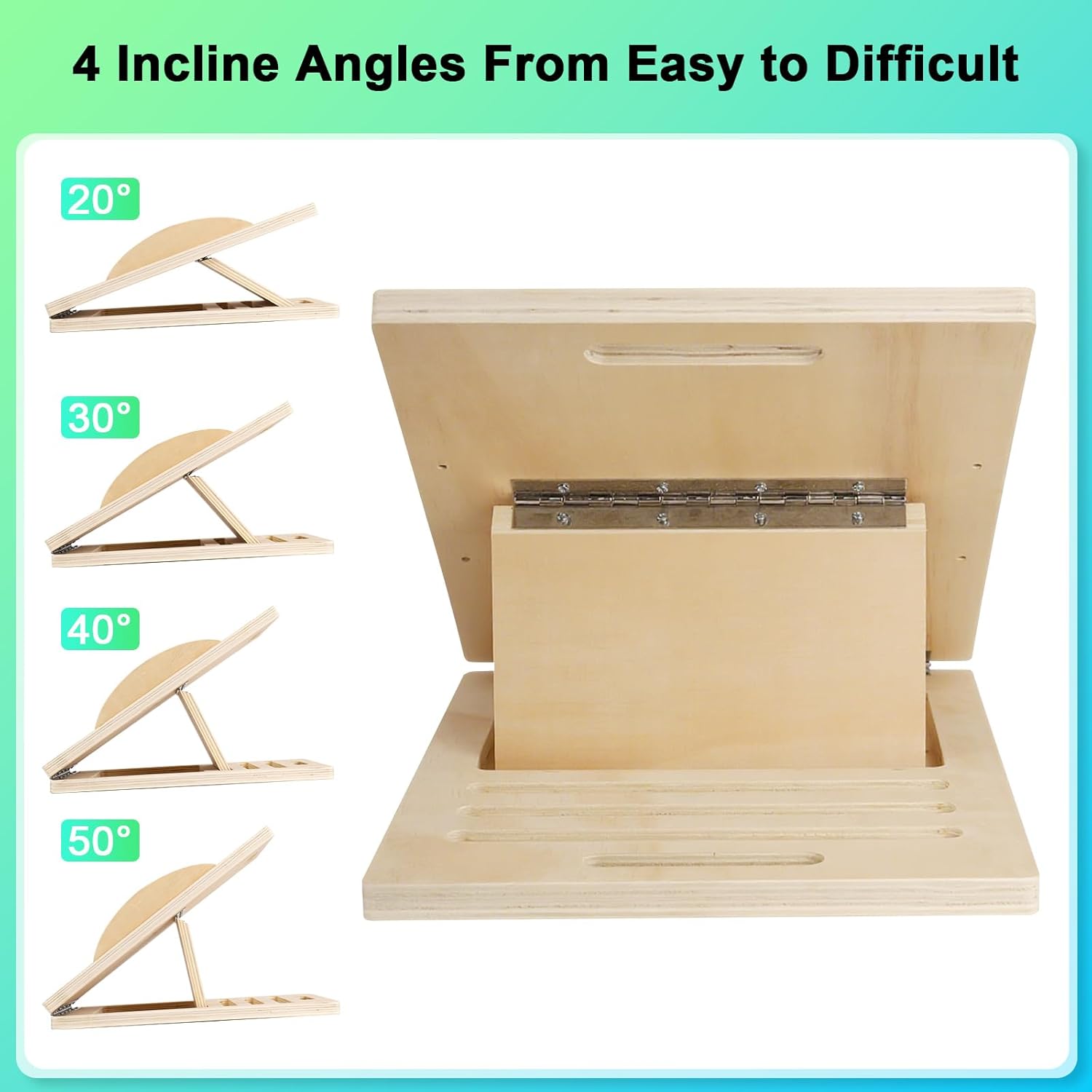 Adjustable Slant Board—Easily adjust the incline of our slant board for calf stretching to suit your fitness level and exercise goals. With 4 adjustable angles of 20°, 30°, 40°, 50°, you can increase the challenge of your workouts as you gain strength and improve your balance
