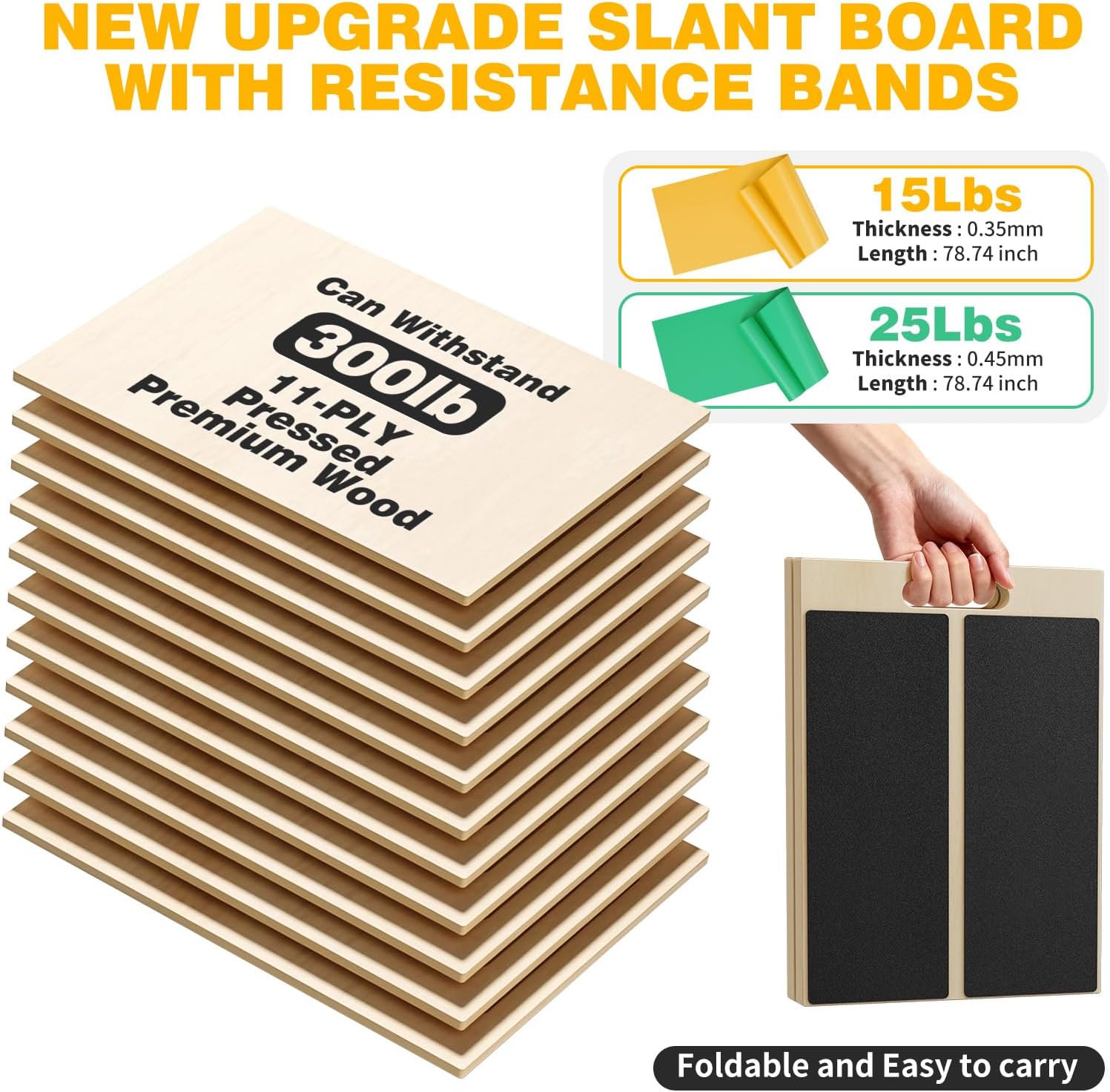 [Upgraded All-in-One Slant Board Set]-Foldable wooden calf stretcher board comes with 2 durable resistance bands, a training poster, and a video tutorial to guide safe full-body workouts and add more exercise options.Making it the perfect fitness tool for beginners and professionals alike.