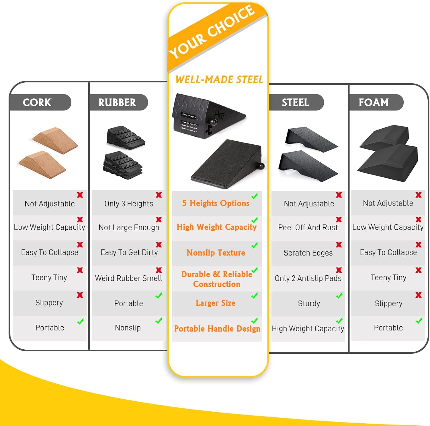 You Need Squat Wedges: Squat With Wedges Can Improve Strength Performance, Enhance Poor Mobility Of Hip, Knees And Ankle, Keep Better Balance And Stability, Reduce Chance Of Injury, But The Premise Is, You Should Find Your Own Squat Wedges, Your Own Height, Not Just Pick Up a Random One And Let Seller Decide Your Height & Angle. So Here It Is, 5 Heights Adjustable Slant Board For Squats. Find Out Which Height And Angle Is Best For You