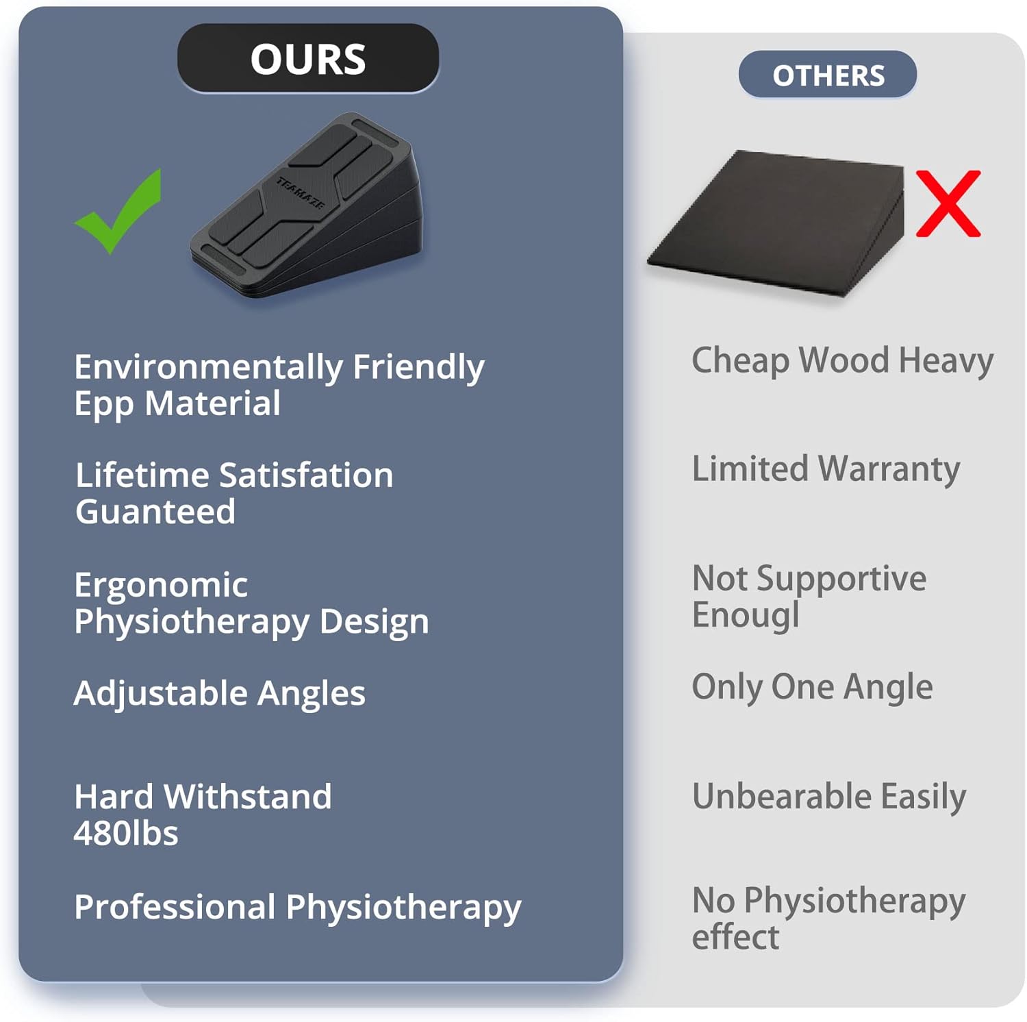 PORTABLE & EASY TO CLEAN ​DESIGN-Slant board for squat weighs only 1.5 pounds and can support a 480lbs adult standing, so it will never deform. It is lightweight and easy to store. It’s stain-resistant and quickly regains its shine just by wiping with a cloth and rinsing with water. You can use it everywhere and be reused many times.
