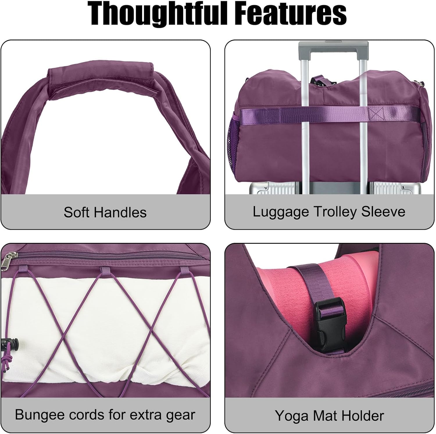 Use Occasions: This bag can be used as a yoga bag, gym bag, pilates bag, duffle bag, dance bag, overnight bag, weekender bag, carrying handbag, or even a hospital bag. The practical loop on the back allows it to be easily attached to suitcases or trolleys, making it a convenient travel companion.