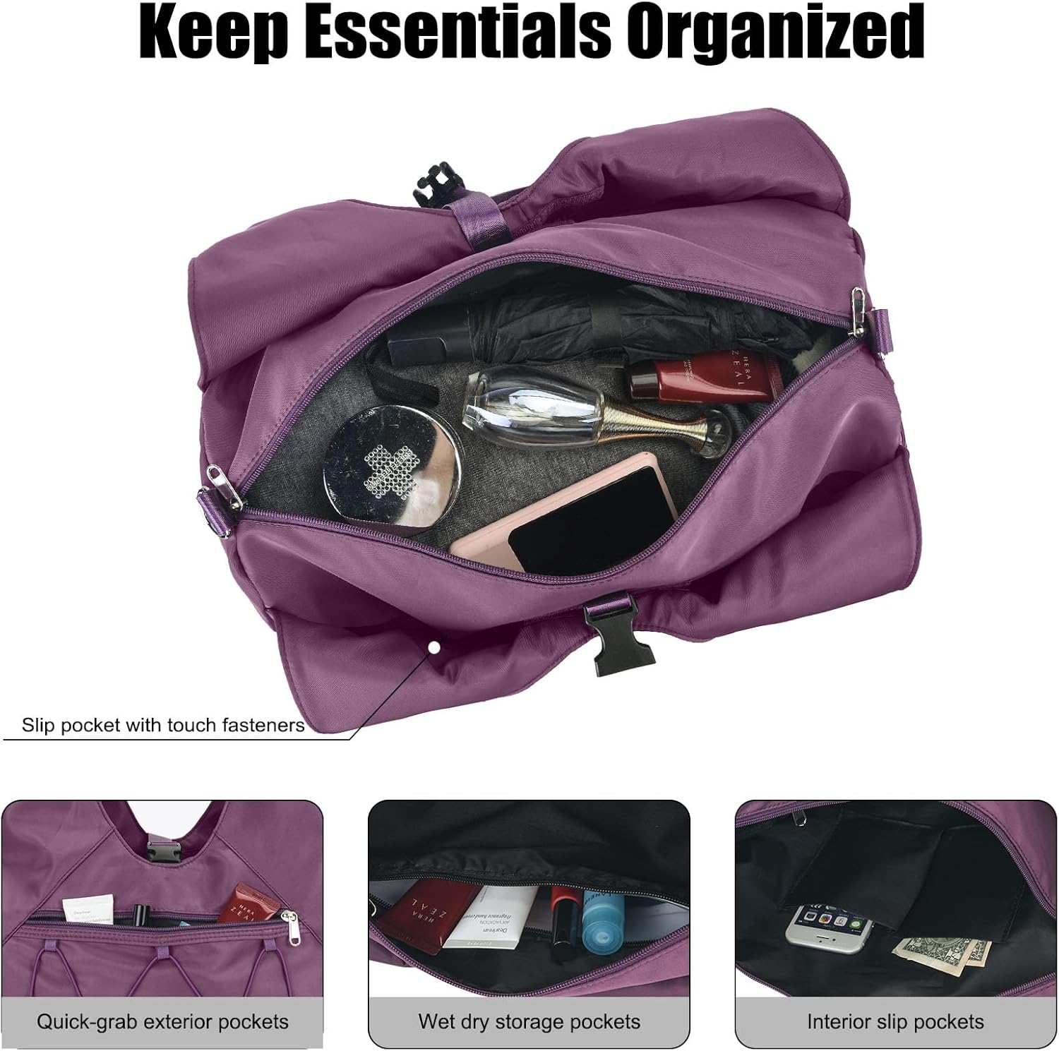 Functional Structure: 1 large main compartment; 1 wet/dry separation pocket; 1 side shoe compartment with ventilation holes; 1 mesh pocket on the opposite side for holding water bottles or an umbrella. Additionally, the bag features 4 independent exterior pockets, 1 front zippered pocket with a mesh design, and a luggage trolley sleeve on the back.