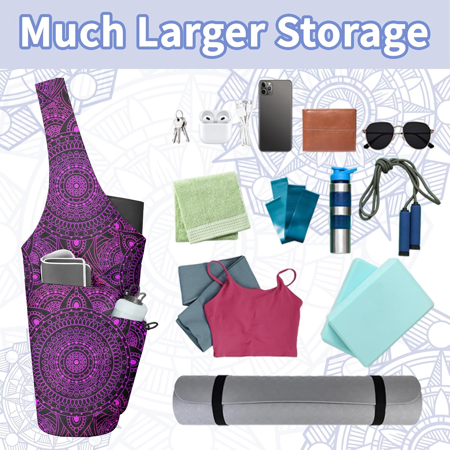 Storage: The top is 15.5 inches wide,so you can store other yoga equipment and accessories like your yoga block,yoga strap,yoga mat towels,bath towels,sandals,or even a change of clothes after working out! Two Pockets Design: one large side pocket for water bottle,face towel and sunglasses. And one small interior zipper pocket for keys,wallet,cards and phone. It’s not enough to have a yoga bags that? just”long enough”. Because it ALSO needs to have enough storage AND vibrate with your persona.