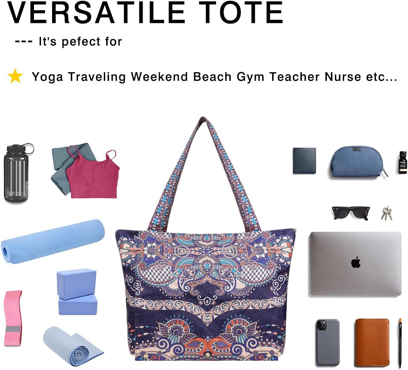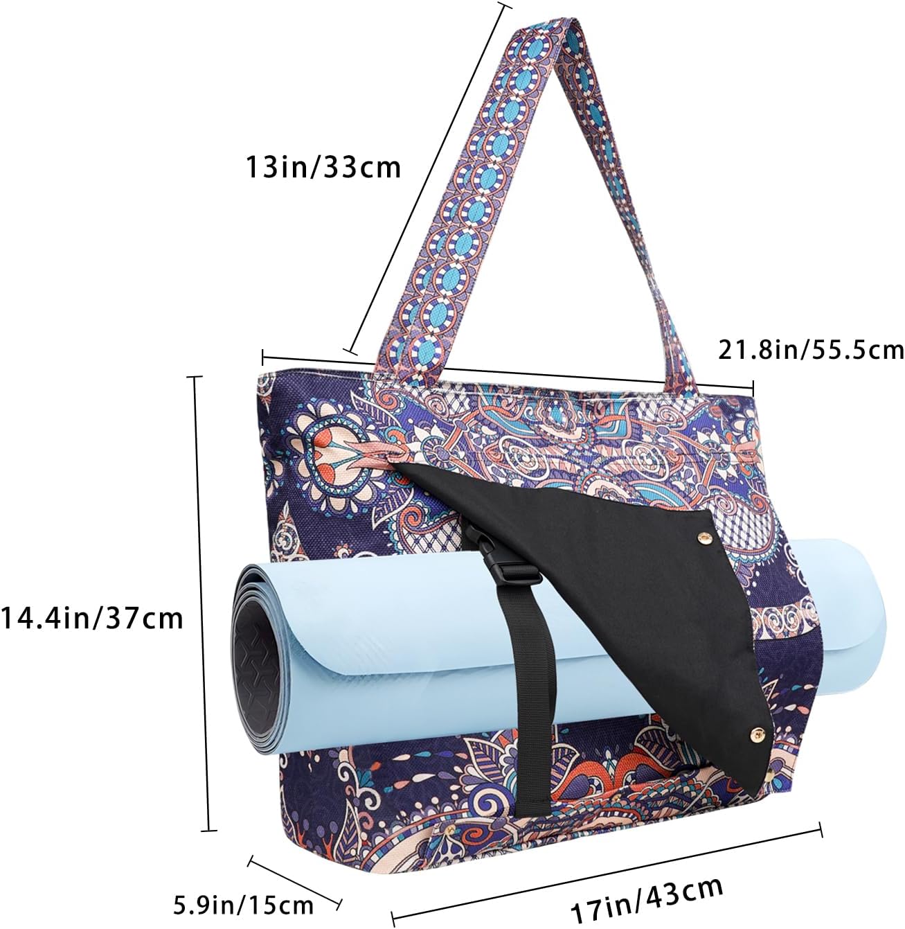 Large Capacity – Size (17″x14.4″x5.9″), Top open to 21.8″. This Tote main pocket Top Full Zipper Close and 1 built in zipper pocket, Back 1 large zipper pocket. With plenty of room inside to hold all the accessories you need for your yoga routine and easy to carry away, Including your yoga mat, yoga brick, yoga towel, yoga clothes, stretching belt, personal items, etc. No more hassle packing and carrying your yoga gear to and from the studio. Just slide on your shoulder and go!