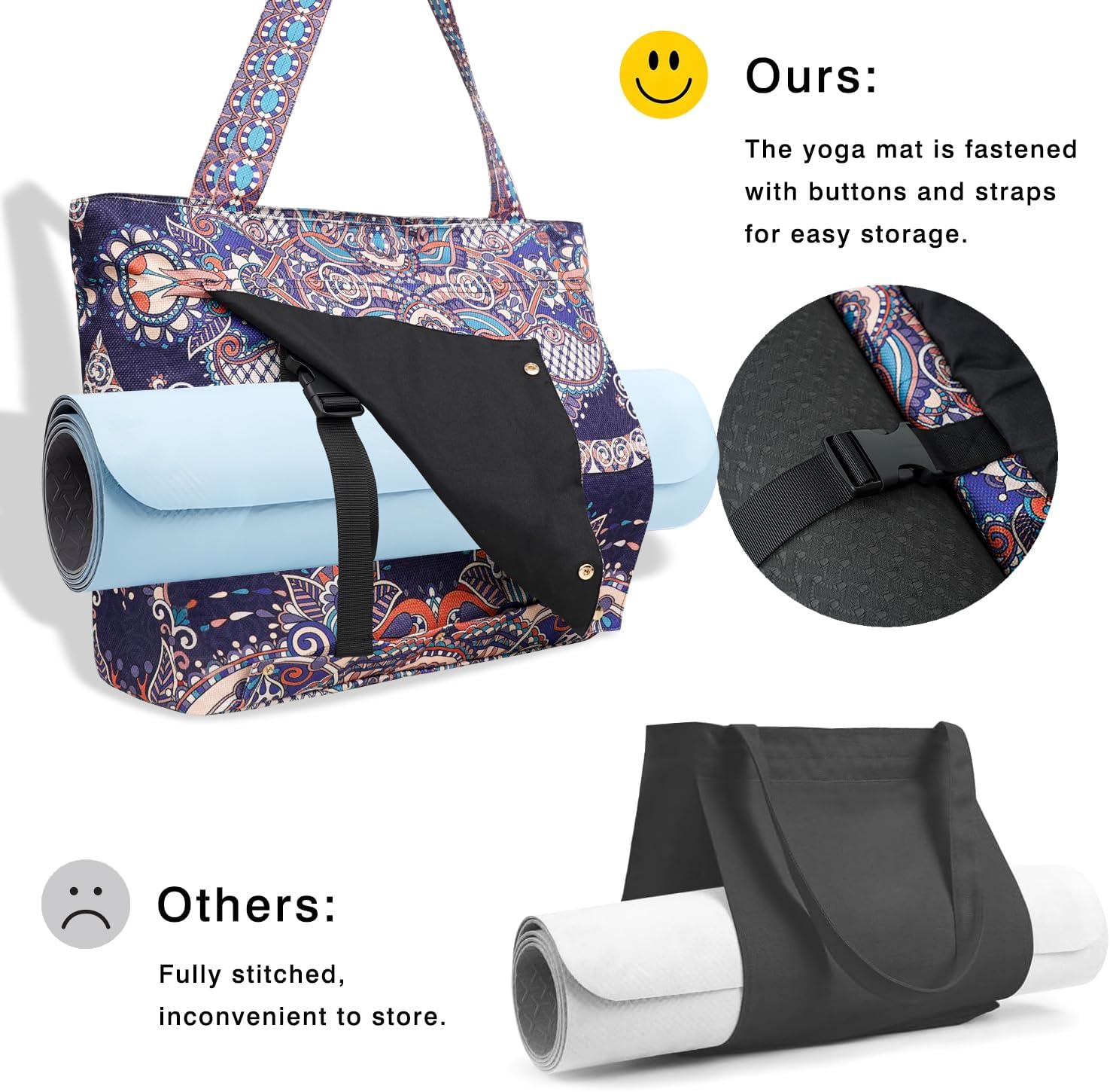 Innovative Mat Compartment Design: The front of the gym bag with yoga mat holder can unfold, making it easy to place and carry yoga mat or jacket. There’s no need to worry about fitting it in, and it won’t take up any space inside the yoga mat storage. The use of buttons and straps allows for quick storage and ensures the yoga mat stays securely without falling out.