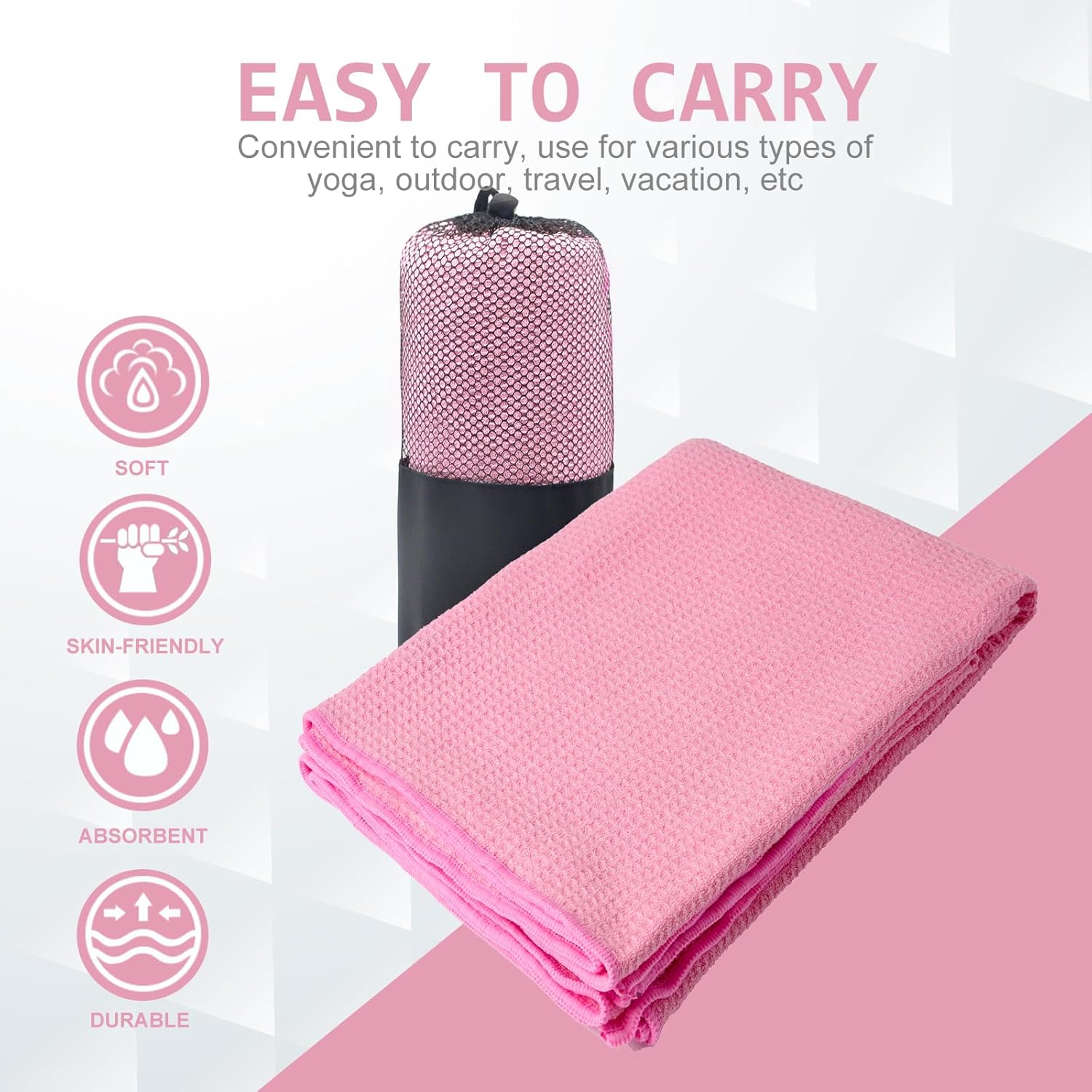 PORTABLE & LIGHTWEIGHT: 72″ long X 24″ wide , suitable for most yoga mats. You can pack your yoga towel for easy carrying and storage. It can also be used as beach towel, camping towel, beach body wrap, rest towel, blanket, table cloth and bath towel