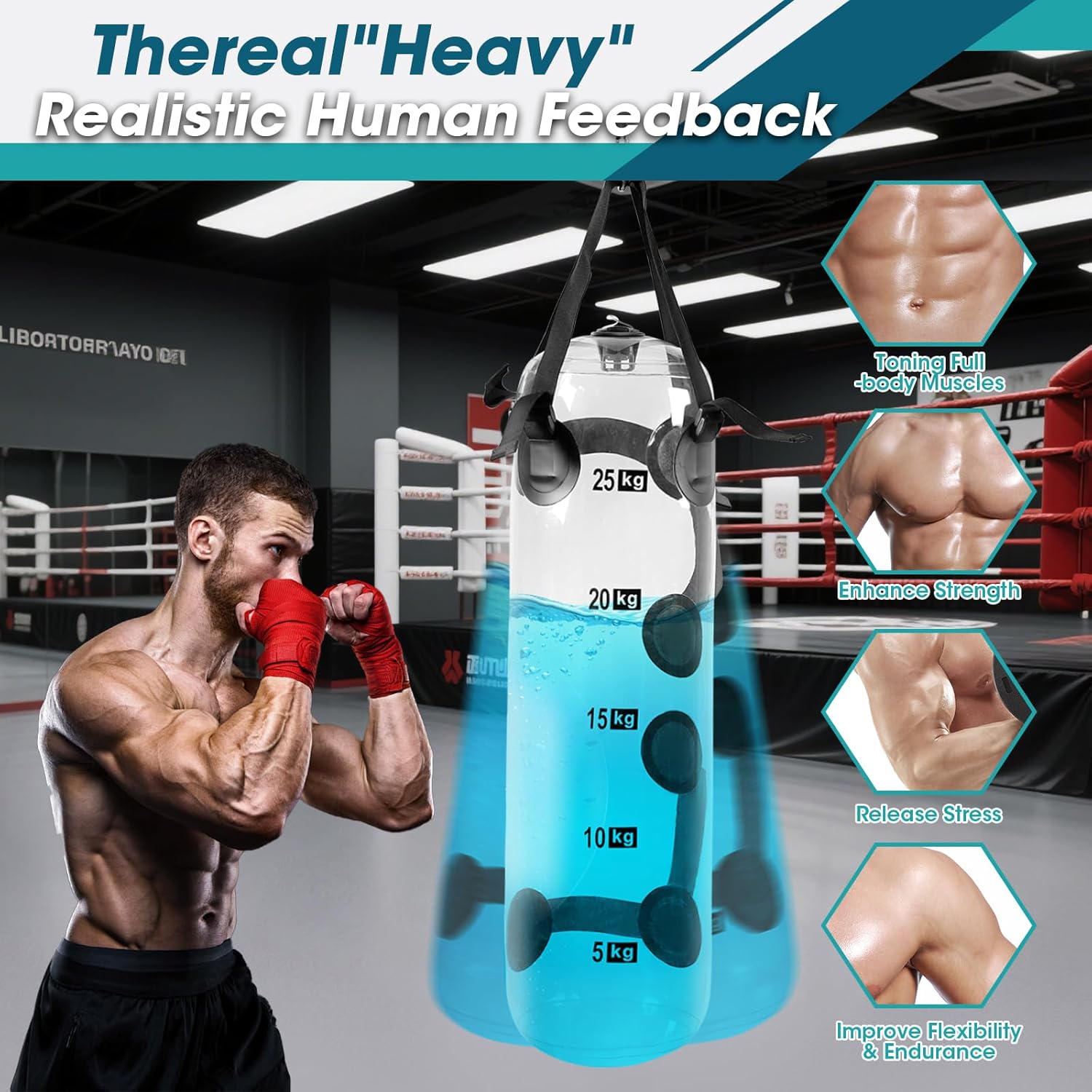 Dynamic Live Weight: Experience the dynamic challenge of a ‘live’ weight with our punching bag. Unlike static sandbags, it responds to your movements for unique repetitions that boost muscle strength, motor skills, and core balance in every workout session.
